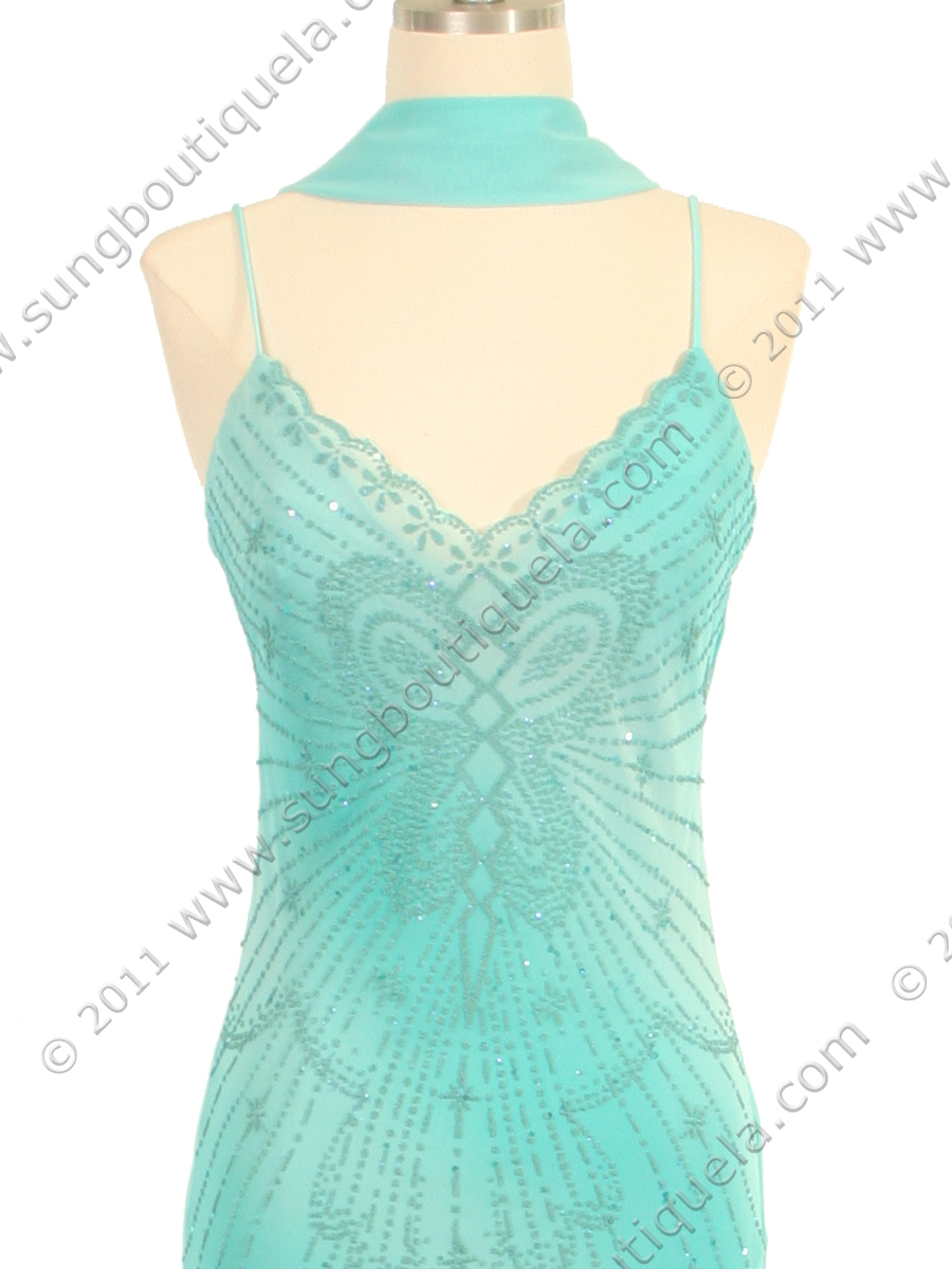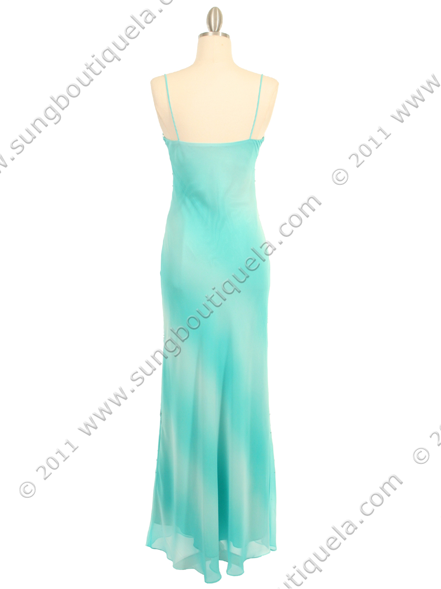Our latest beautiful tie dye evening dress in fading shades of aqua and blue. The front of the dress features gorgeous faux mini pearl design pattern that is accented with shiny sequins. Simple spaghetti straps with floral lace neckline; and the graceful floor-length silhouette simply adds sophistication. Polyester lining; no zipper; slip-on; and matching shawl included. Made in USA; 100% polyester.