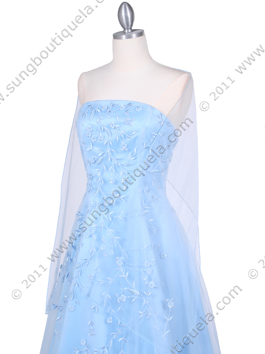 This elegant evening gown features simple neckline with removable spaghetti straps. Floral embroidery lace overlays a same tone color lining. Fully lining with an extra layer of netting for added fullness. This is a perfect dress for prom or for that special occasion. Matching shawl is included. Lower back zipper closure ensure the perfect fit. Imported. Built-in cups. Shell and lining made from 100% polyester.