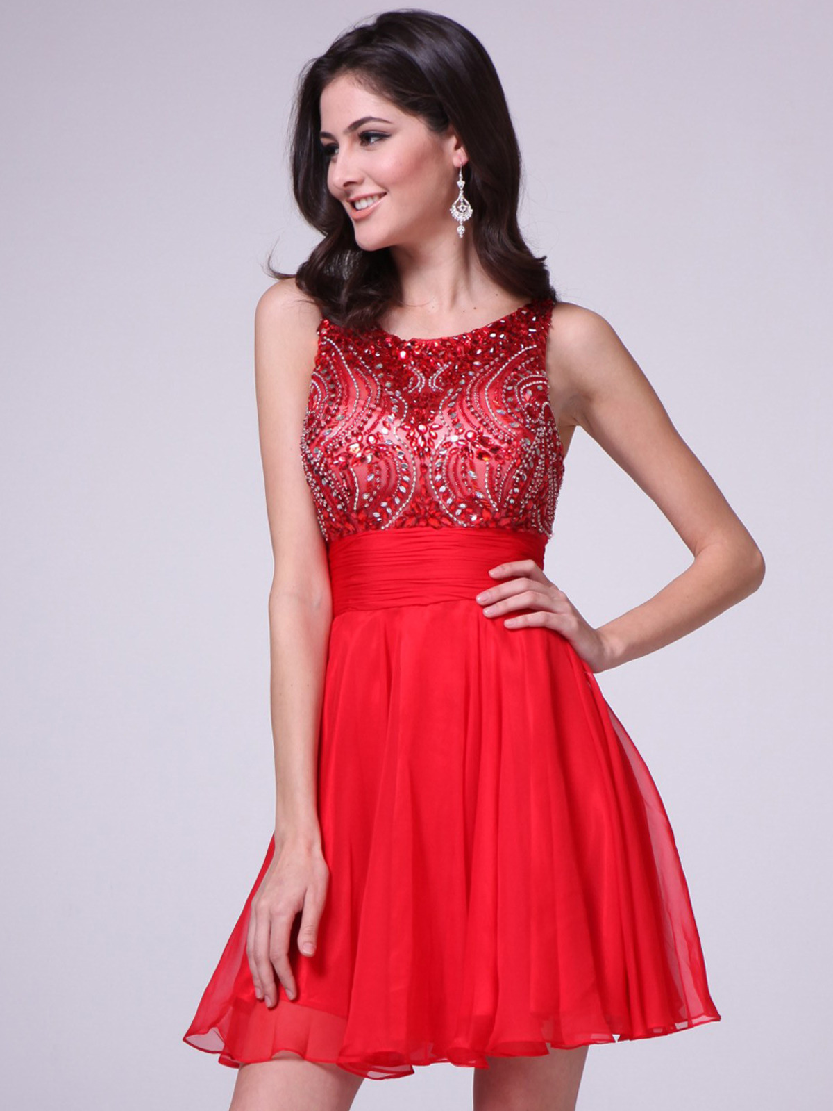 Bateau-neck with jewels details the sheer bodice. Softly gathered waist and mesh thigh high length hem completed the look. -Approximate 34 inches from shoulder to hem. -Zipper back entry. -Fully lined. -Polyester. -Imported.