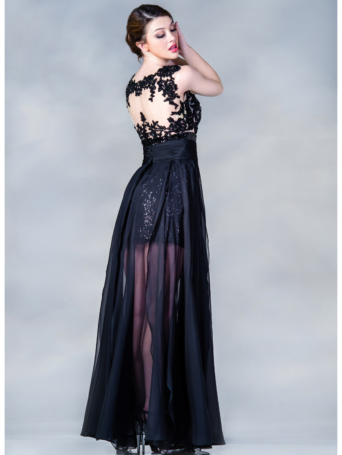 This sexy evening dress features delicate bead work set upon a thin see-through underlay bodice. The skirt is covered in sequins and draped by a chiffon overlay. -Zipper entry. -Approx. 36 inches from underarm to short hem. -Approx. 58 inches from under to long hem. -Fully lined. -Polyester. -Imported.