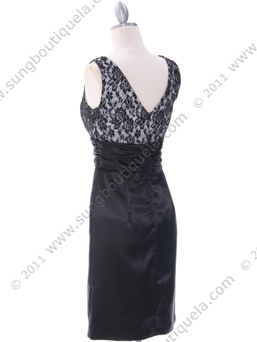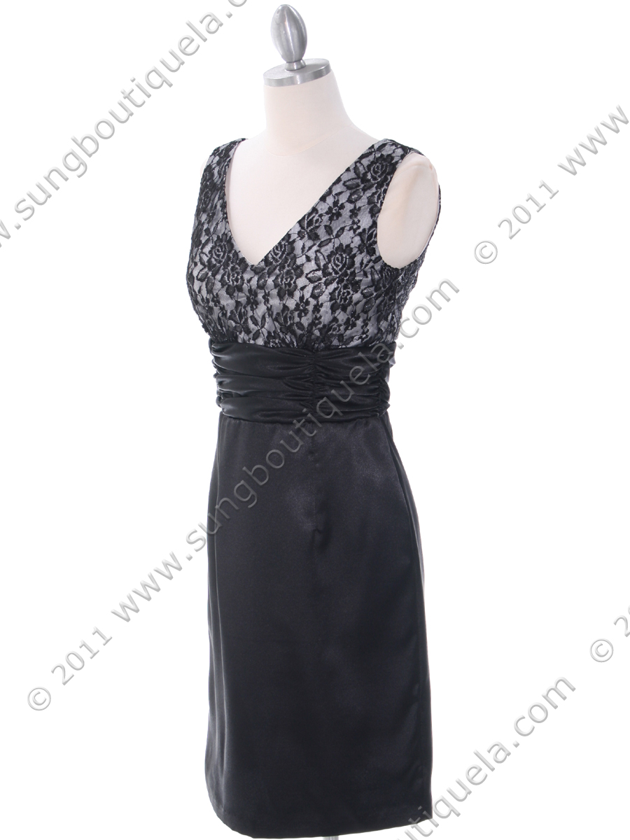 This sweet and sassy cocktail dress features a lace V-neckline overlaying a silver tone bodice. Satin fitted skirt is alluring to the eye. - Back zipper. - Built in cup. - Approx. 38 in. from Shoulder to hem. - Polyester. - Made in USA.