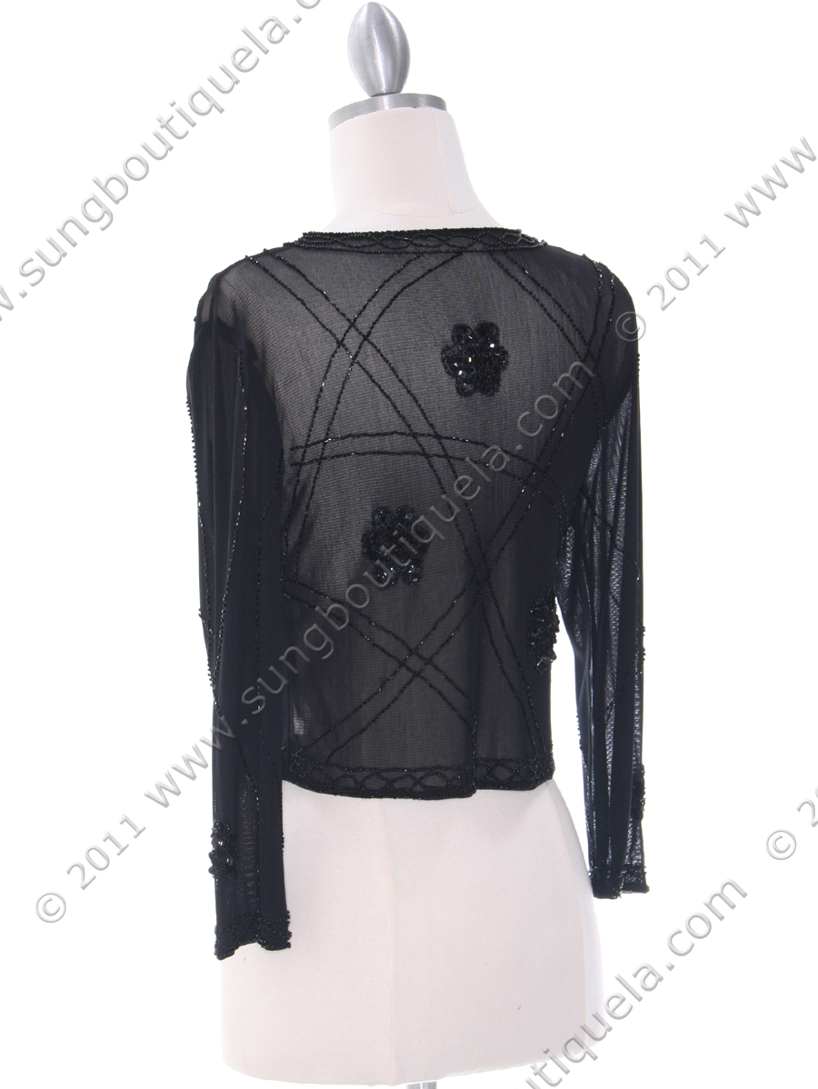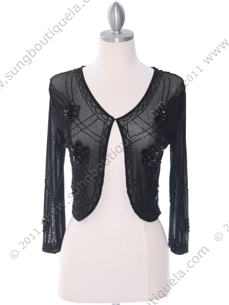 This elegant lace bolero jacket features beautiful beaded embroidery details the bodice. - Imported. - Made from 100% polyester.