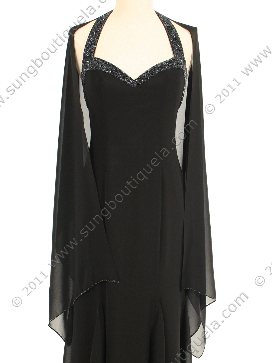 Brilliant hand sewed dazzling beads decorated around sweetheart neckline and the back. Fluid, floor-length dress with godet inserts add movement at the hem. Beautiful and elegant. Back center zipper; beaded matching shawl included. Imported; 100% polyester.