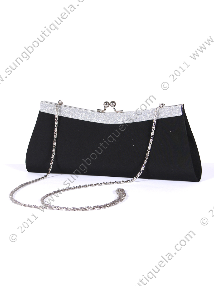Metal frame tops a shimmery structured clutch with a drop-in chain strap. - Dimensions (inches): 11 W x 4.5 H x 2 D. - Shoulder chain strap drop: 22 inches. - Interior credit card pocket. - Kiss-lock closure. - Imported.
