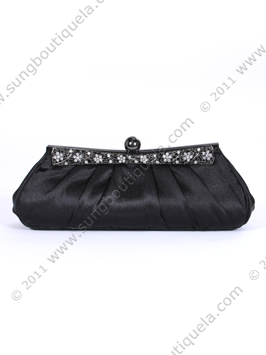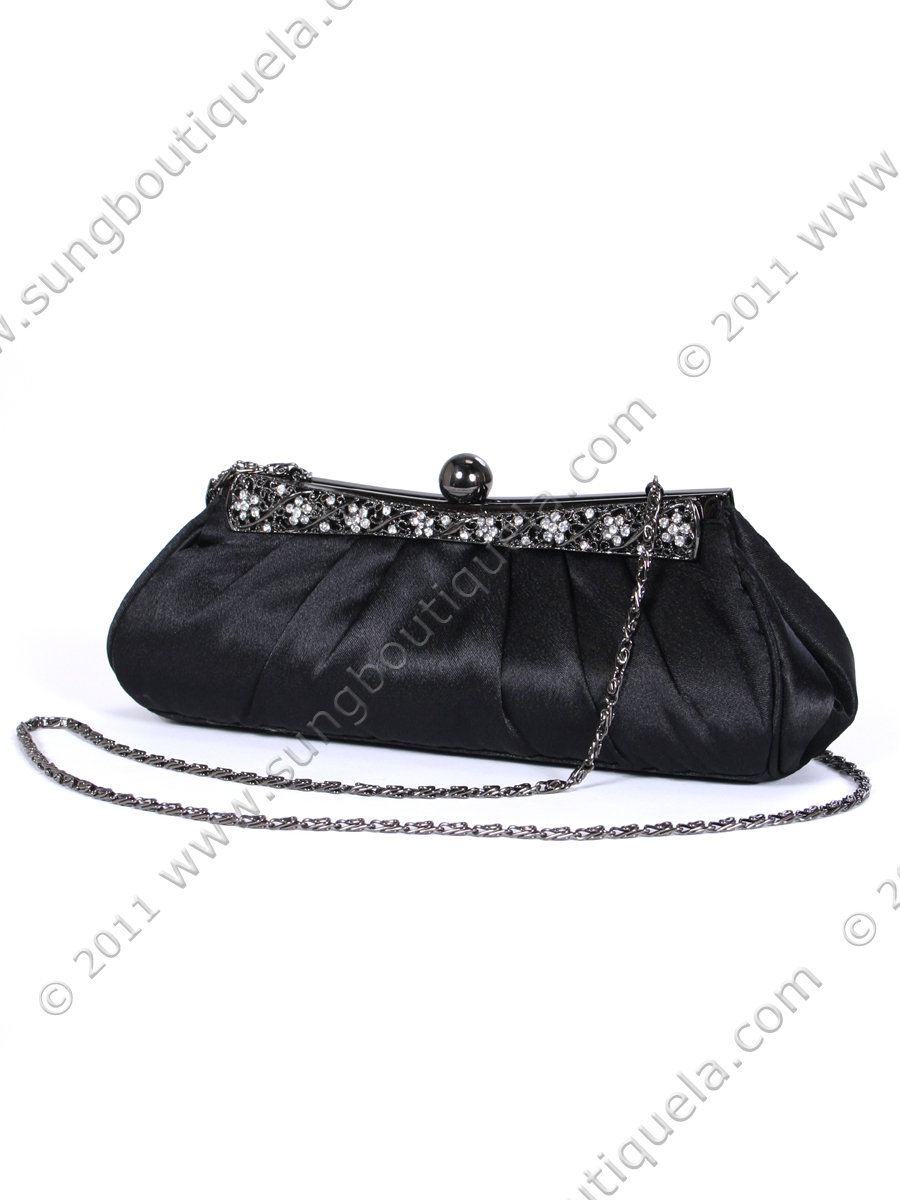 Bejeweled frame with push-lock closure tops a soft, pleated satin clutch with a drop-in chain strap. Available in Ivory, Navy, and Black. - Dimensions (inches): 9 W x 3 H x 2.5 D. - Shoulder chain strap drop: 22 inches - Interior credit card pocket. - Imported.