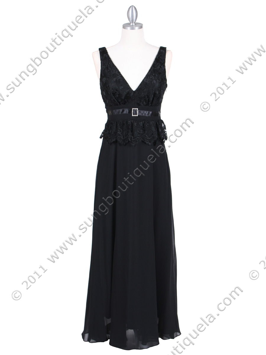 This elegant design dress features v neckline with lace bodice top. Satin at the empire waist adorns with a rhinestone buckle. Sheer chiffon dress overlays a brilliant same color lining. A graceful floor-length silhouette simply adds sophistication. Side zipper entry. Made in USA; 100% polyester.