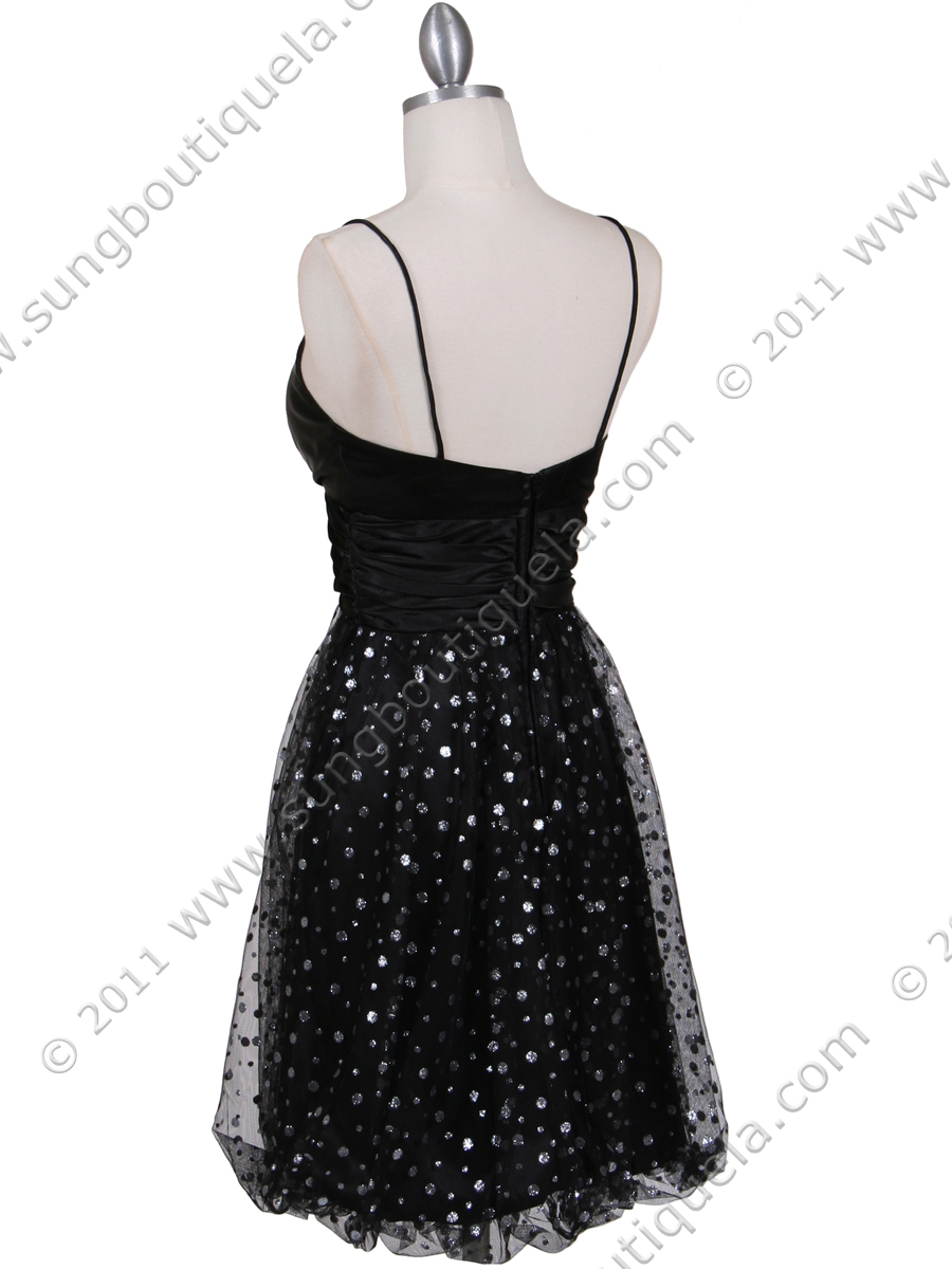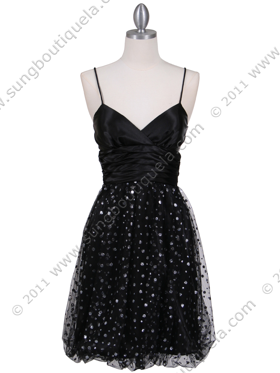 This beautiful cocktail dress features spaghetti straps with sweetheart neckline. Wide pleated waist with glittering polka dot patterned sheer mesh dress sparkles over a same tone charmeuse lining finished with subtly bubble hem. Made in USA. 100% polyester. Back center zipper. Matching shawl included.