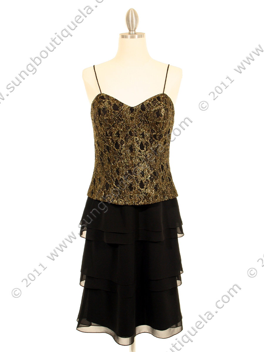 This gorgeous cocktail dress features spaghetti straps with heart shape neckline. A laced top styles in gold with black underlay, and a tiered chiffon layers skirt with flutter hem. Romantic and elegant. Matching shawl included. Imported; 100% polyester.