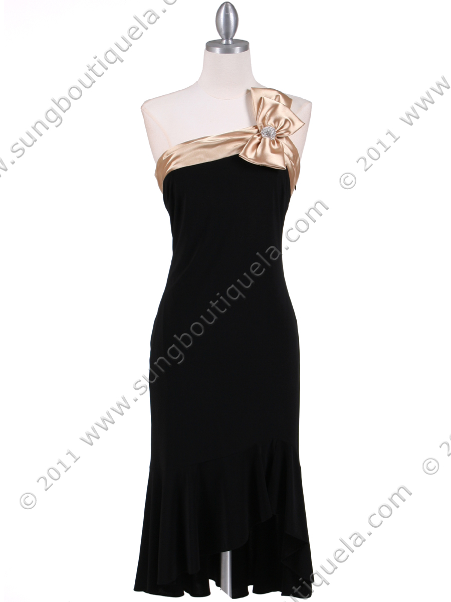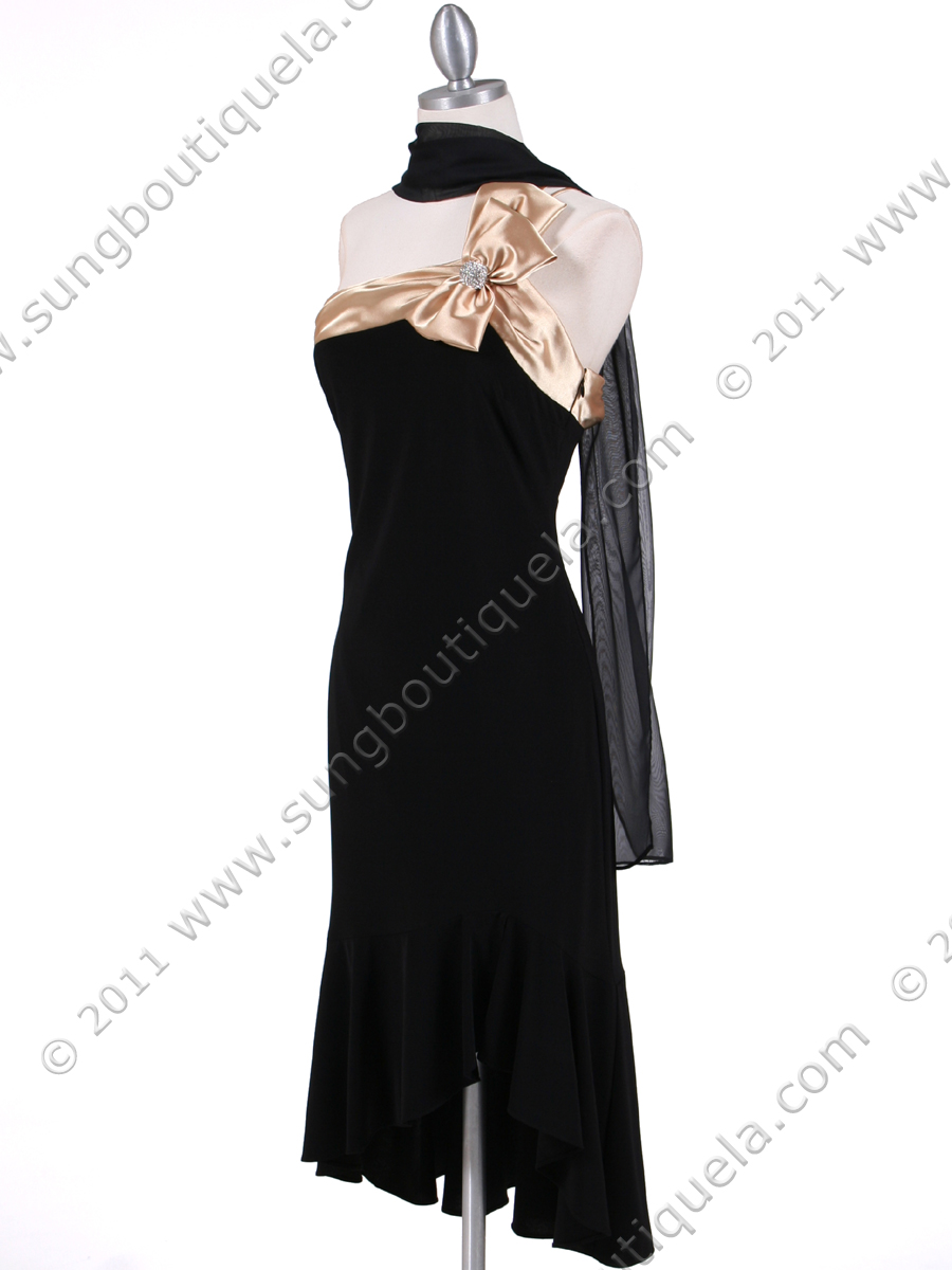 This elegant cocktail dress features a satin bow with rhinestone brooch details the shoulder. High-low fishtail hemline finish the look. Side zipper. Matching shawl included. Made in USA. 100% polyester.