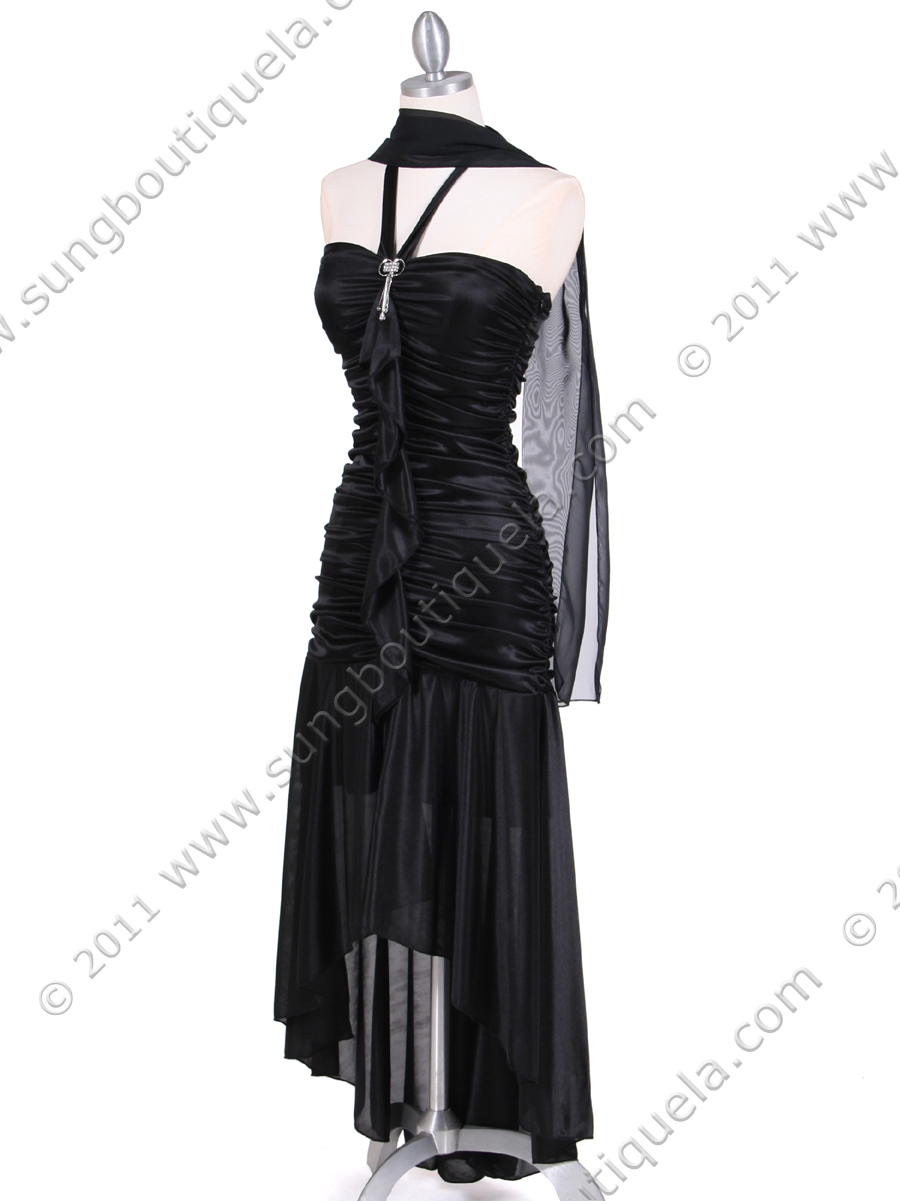 Beautiful and sexy. This gorgeous evening dress features halter top with shirred bust, and gathered ruffled drape cascading from attached rhinestone pin. Drop waist with asymmetrical ruffled hem. This is the dress for any special occasion. Side zipper; matching shawl included. Made in USA; 100% polyester.