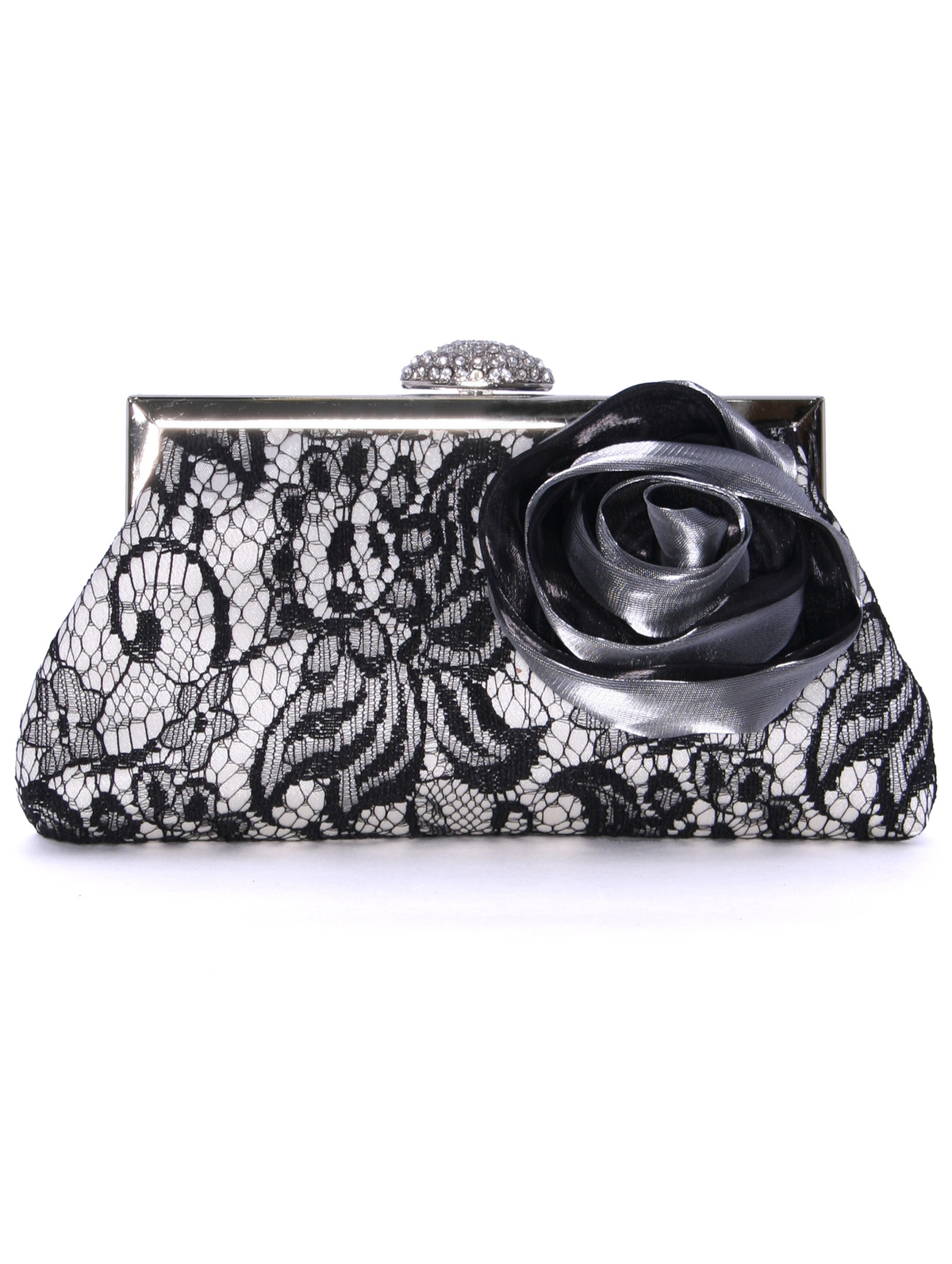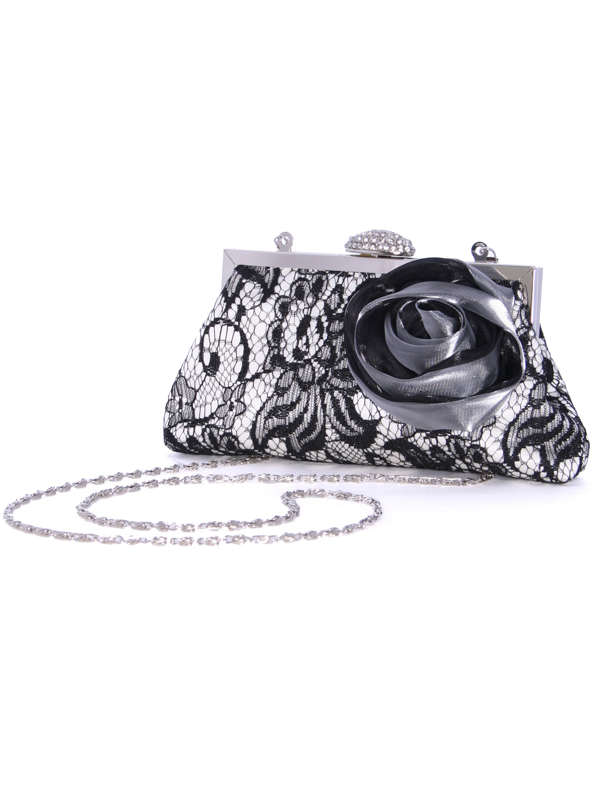 Lace evening bag is styled with gorgeous sheer two-toned black and charcoal grey rosette. - Dimensions (inches): 9 W x 4.5 H x 2.5 D. - Shoulder chain strap drop: 25 inches. - Hand held chain strap: 6 inches. - Inside pocket compartment. - Imported.
