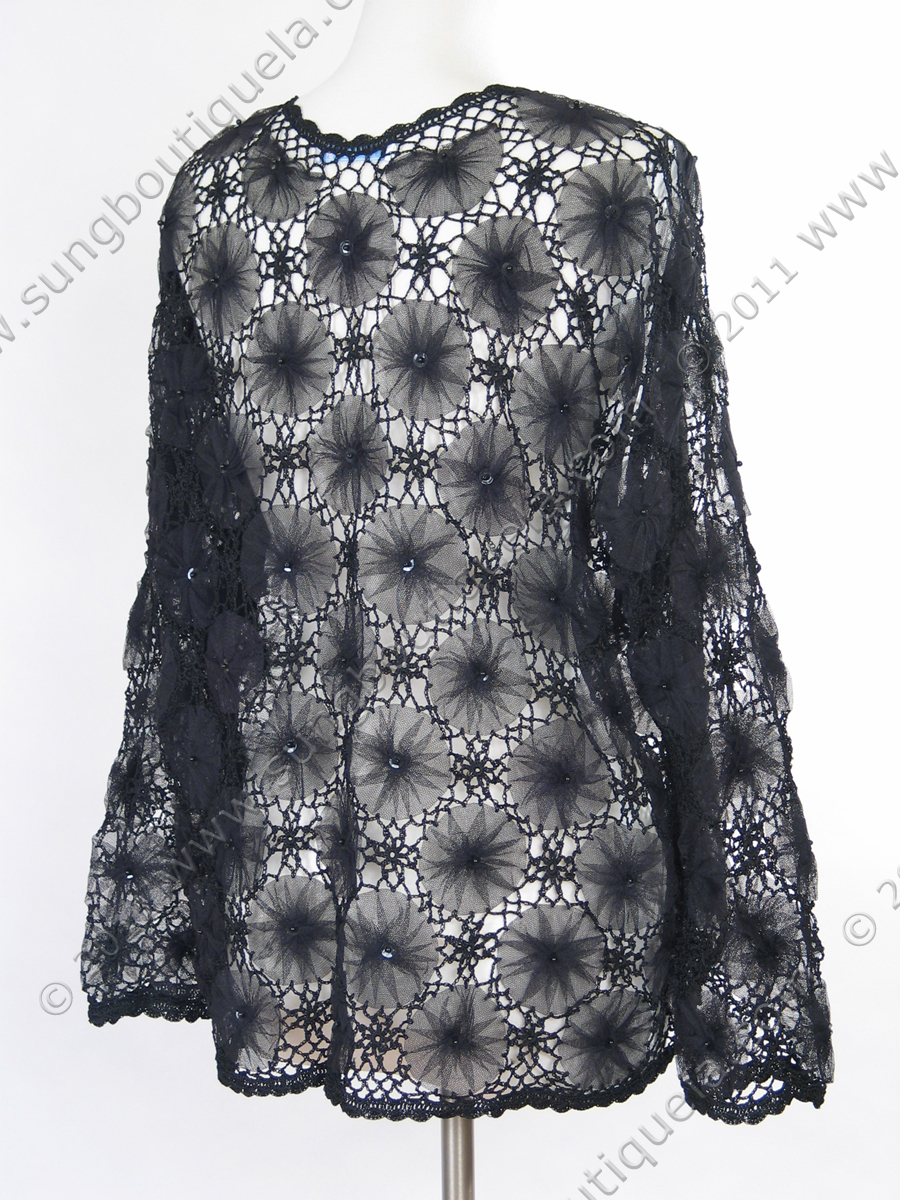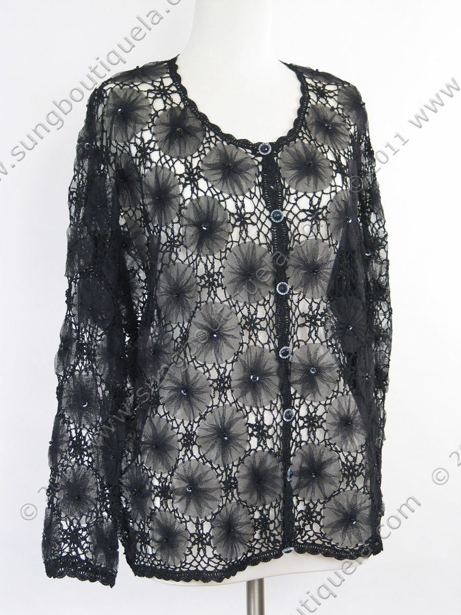 This beautiful laced cardigan is knitted with flower patterns and it is great for casual wear. Made from 100% polyester. Imported. Only available in XL.