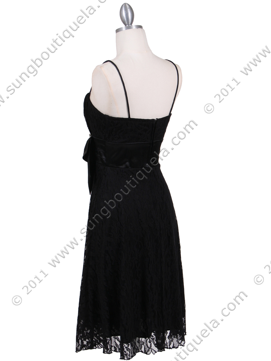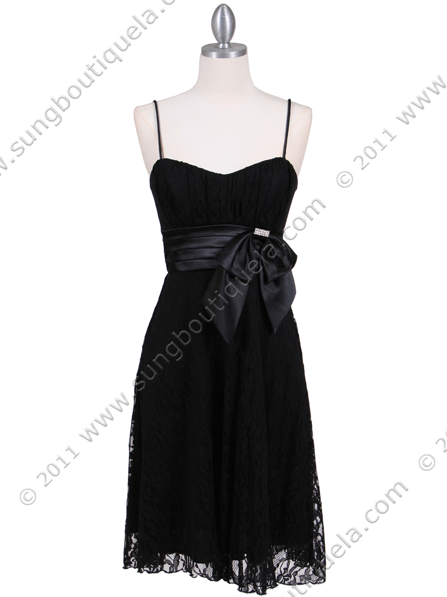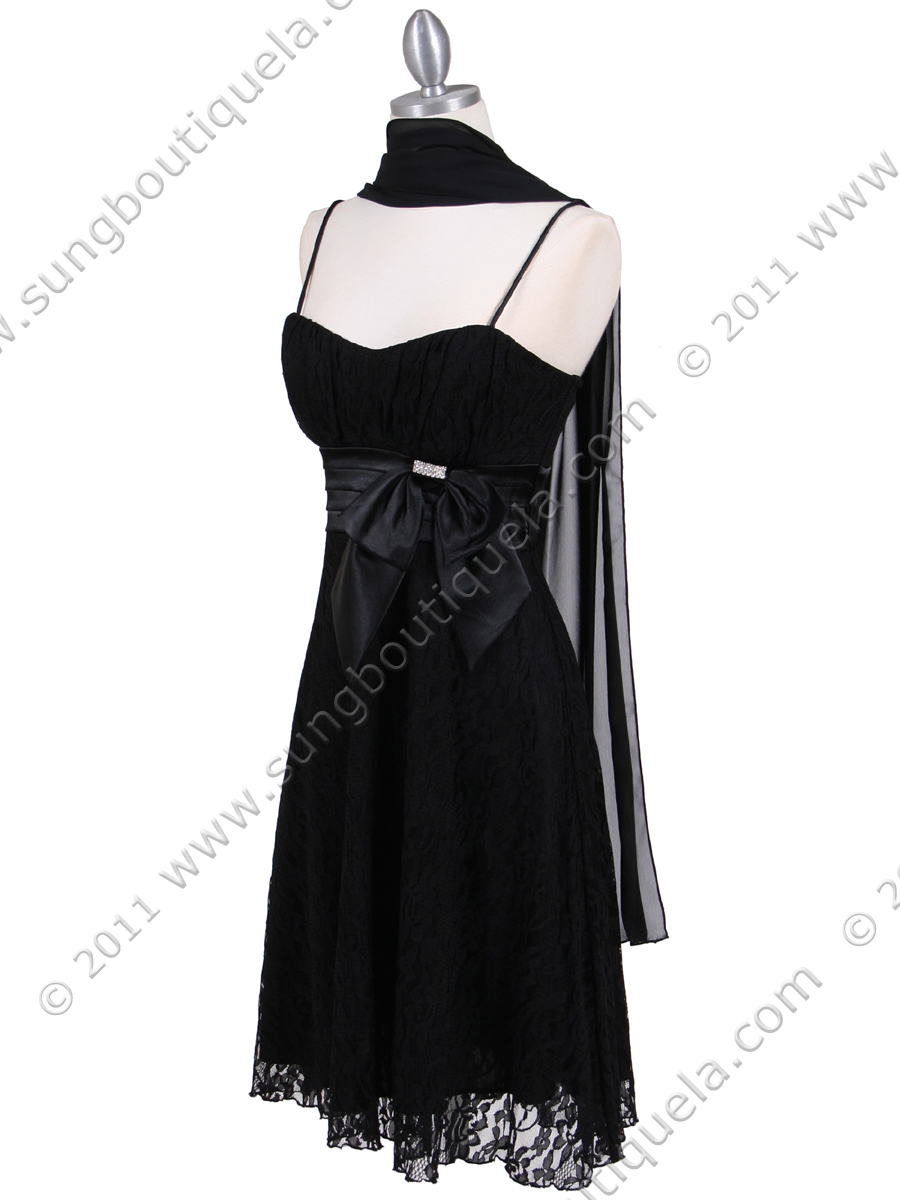 This beautiful lace cocktail dress features spagehtti straps with sweetheart neckline. Charmeuse waistband and bow adorn with a sparkling rhinestone pin. Simple and elegant. - Matching shawl included. - Back center zipper. - Padded bust with boned bodice. - Approx. 40 in. from shoulder to hem. - Fully lined. - 100% polyester. - Imported.