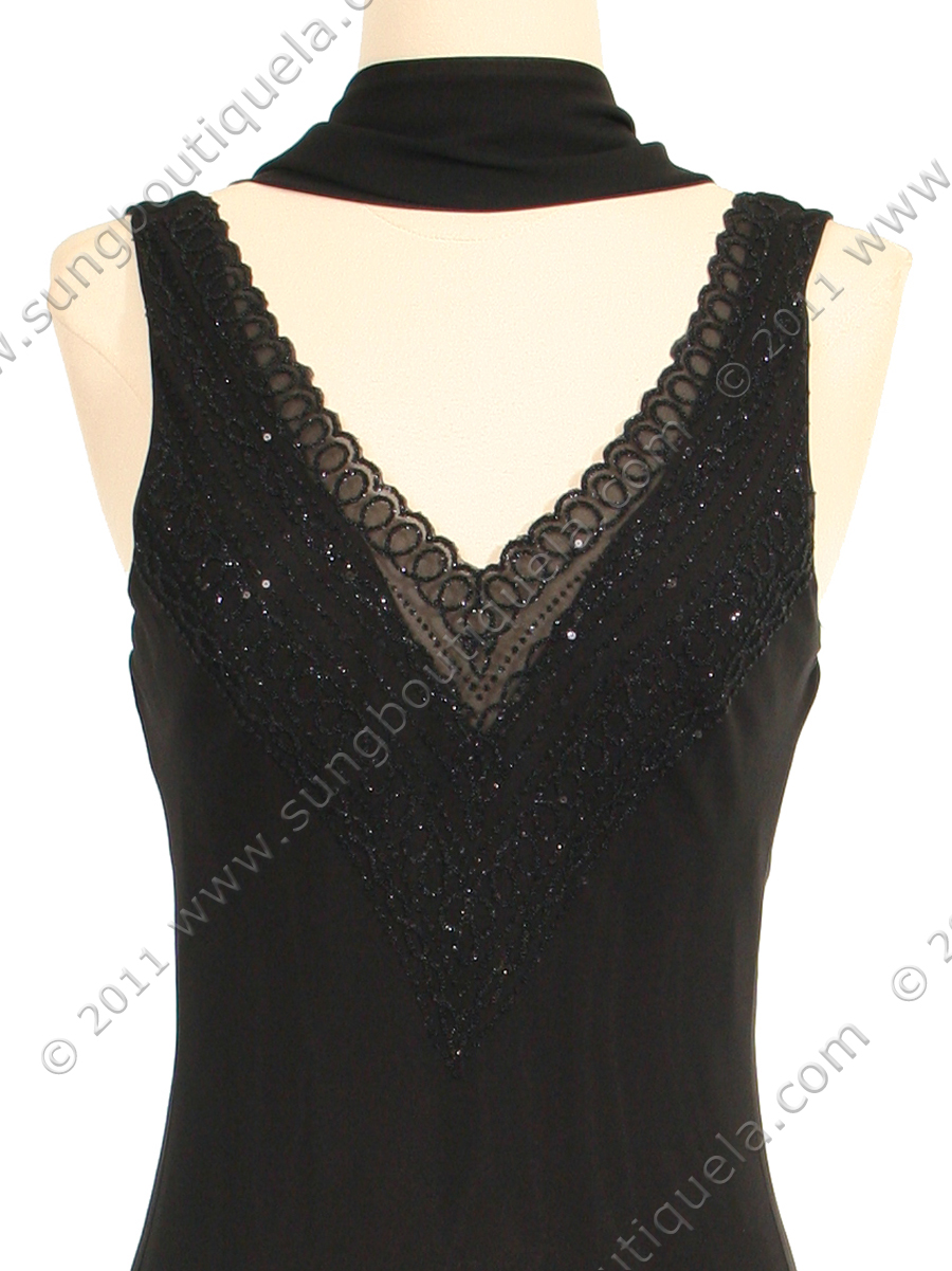 This beautiful black cocktail dress features deep V floral lace neckline, and sheer chiffon overlays a brilliant same color silky lining. The front of the dress features gorgeous faux mini pearl with elegant floral pattern design. Drop waist with handkerchief hem adds a sense of flirtatious. Made in USA; 100% polyester.
