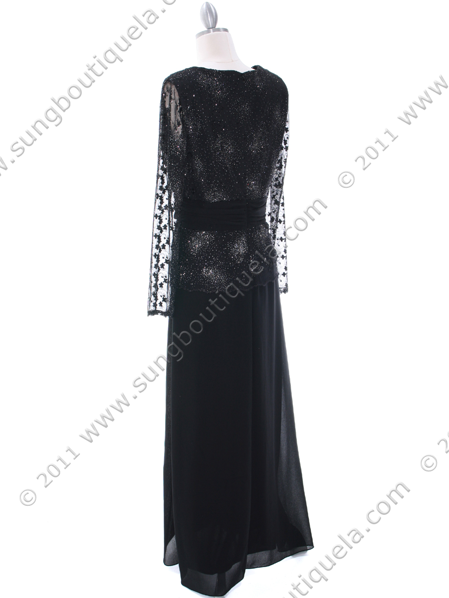 This gorgeous floor length dress features light shoulder pads and floral stitching through out the sleeves and top half of the dress. Lovely shimmery texture as well as a black sash that adorns the waist. - Approx. 56 in. from shoulder to hem. - 100% polyester. - Imported. - Back zipper entry.