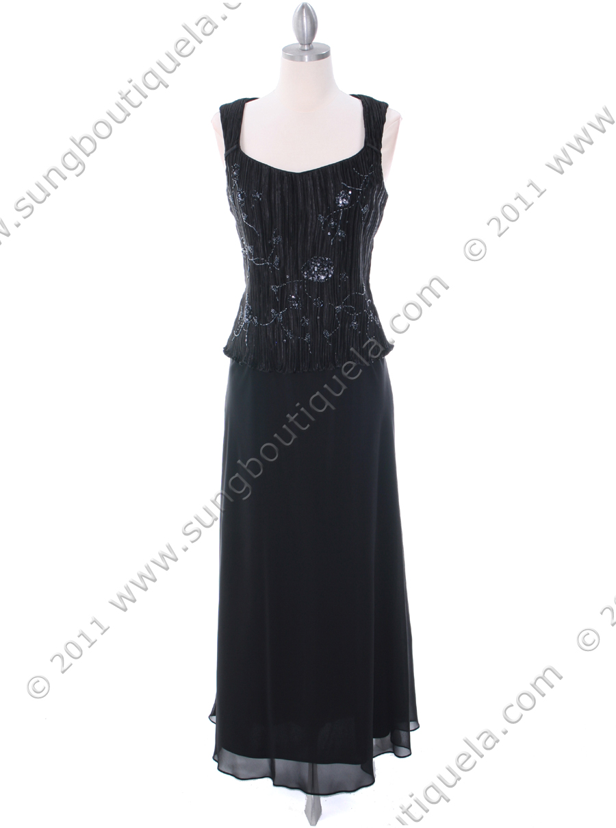 This beautiful and classic evening dress features stylish beaded floral like embroidery. It also features flattering pleats through out the entire top portion of the dress. - Matching shawl included. - Back zipper. - Approx. 55 in. from shoulder to hem. - Fully lined. - 100% polyester. - Imported.