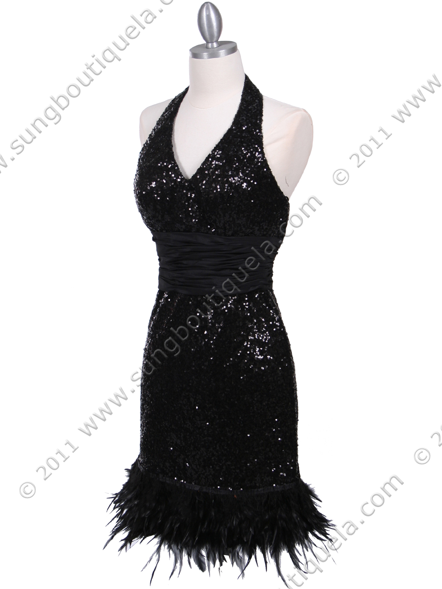 This stunning halter cocktail dress features sequins cover all over the bodice with sash adorns the waist. Feather hem line finishes the the fun and sexy look. - Back center zipper. - Padded. - Approx. 33 in. from shoulder to hem. - 100% polyester. - Imported.