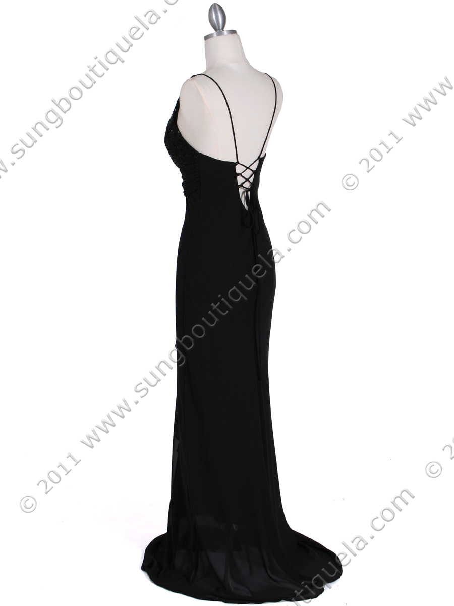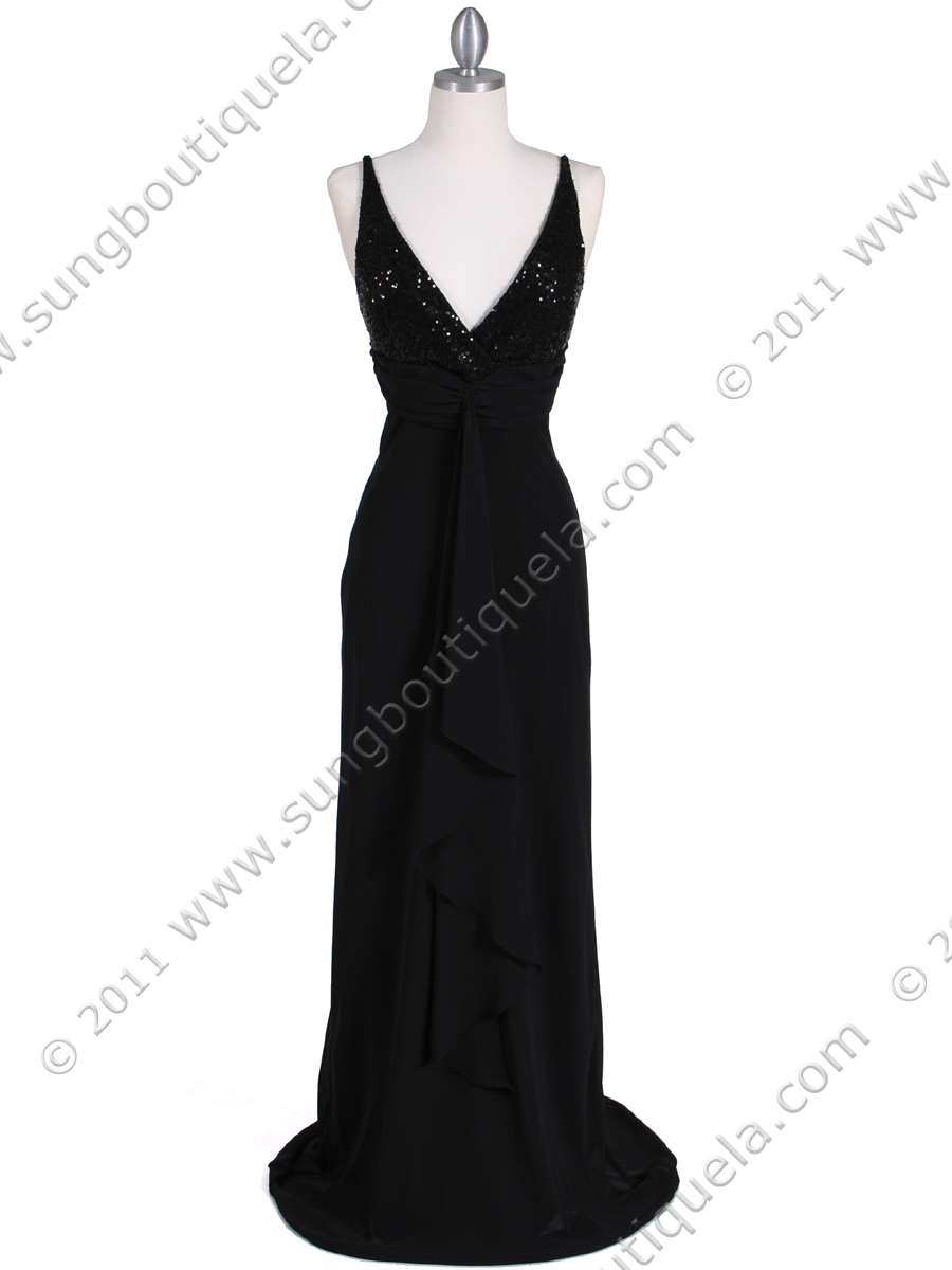 This beautiful evening dress features spaghetti straps with deep v neckline. Glittering sequins details the bodice above flowing chiffon skirt. Ruched empire waist with cascading ruffle details the front. Crisscross back straps ensure secure fit. - Matching shawl included. - Back center zipper. - Padded cup. - Approx. 62 in. from shoulder to hem. - Fully lined. - 100% polyester. - Made in USA.