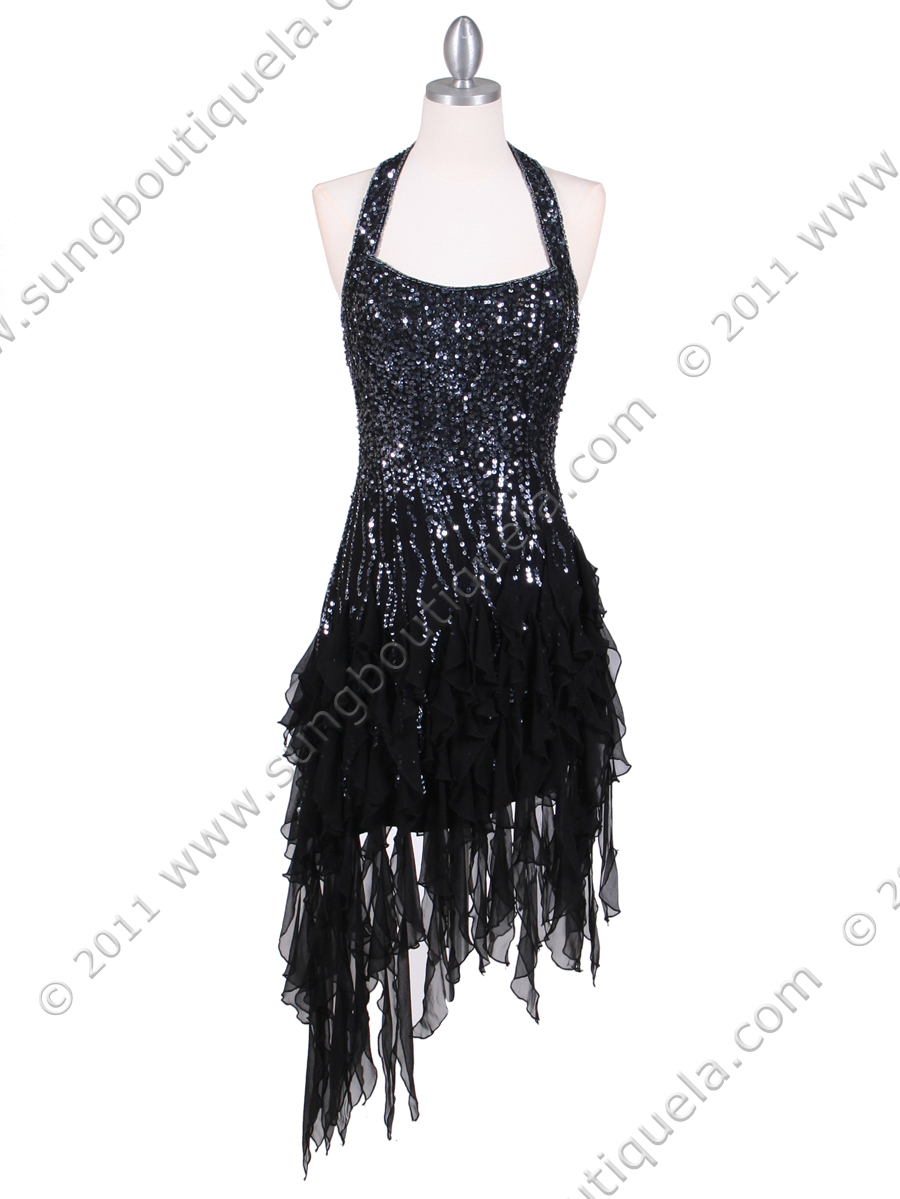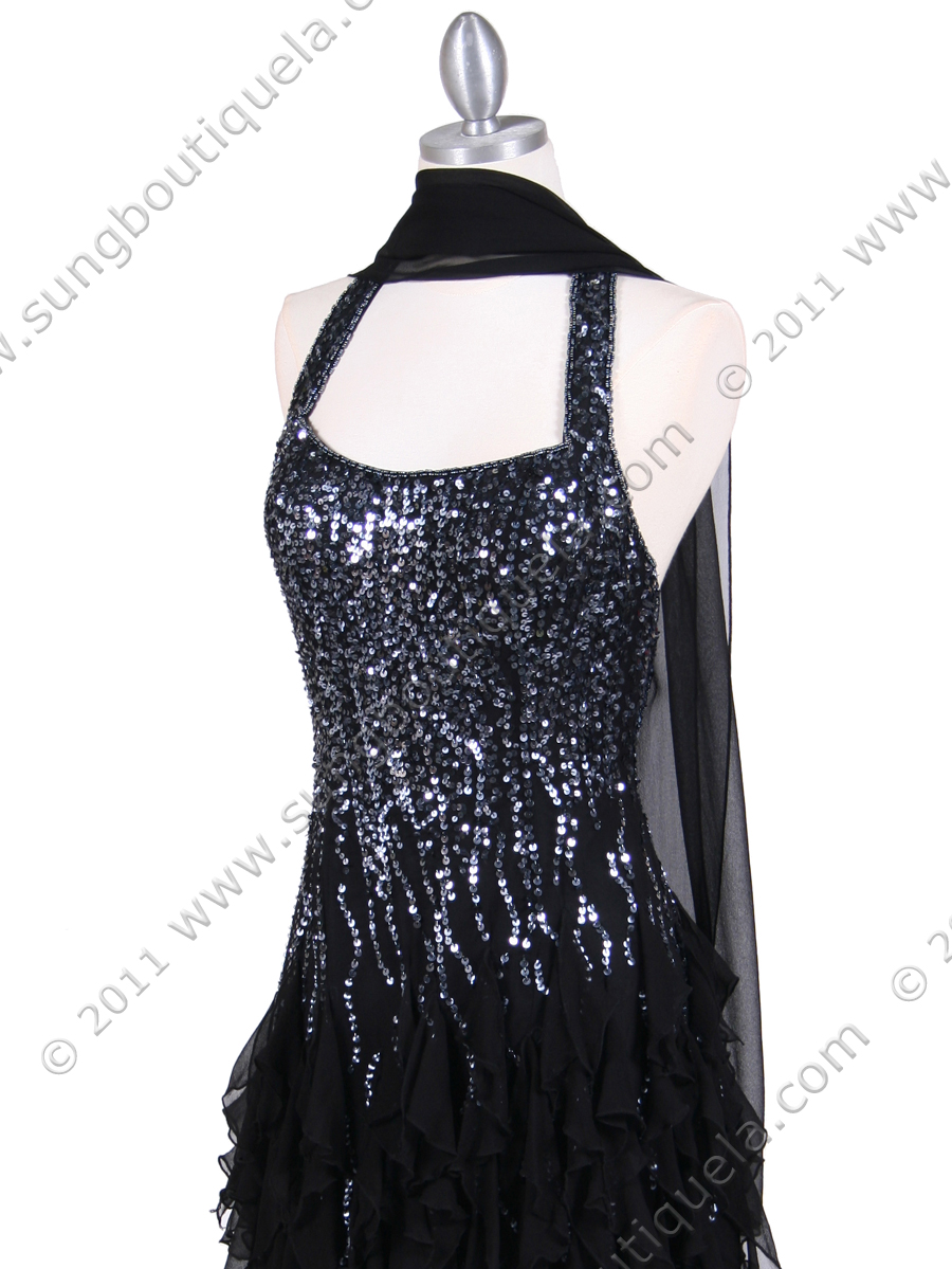 This gorgeous halter dress features simple neckline. Cascading chiffon ruffles circle the hem of a fitted, sequined dress. Matching shawl included. -Imported. - 100% silk. - Fully lined. - Back center zipper.