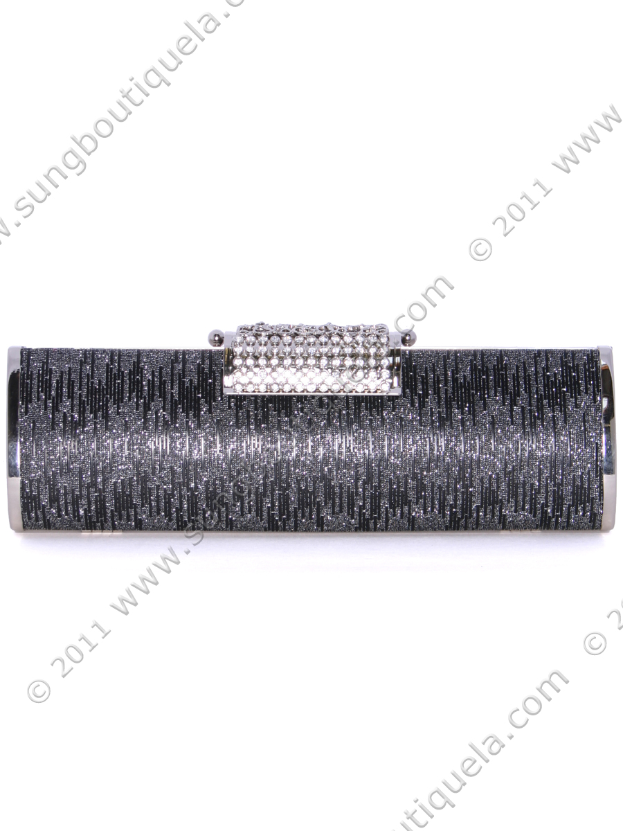 Elegant glittering hard bodied clutch is styled with sparkling rhinestone clip and decor. Two-toned. - Dimensions (inches): 10.5 W x 4 H x 2 D. - Zipper pocket and small pocket compartment. - Shoulder chain strap drop: 24 inches. - Imported.