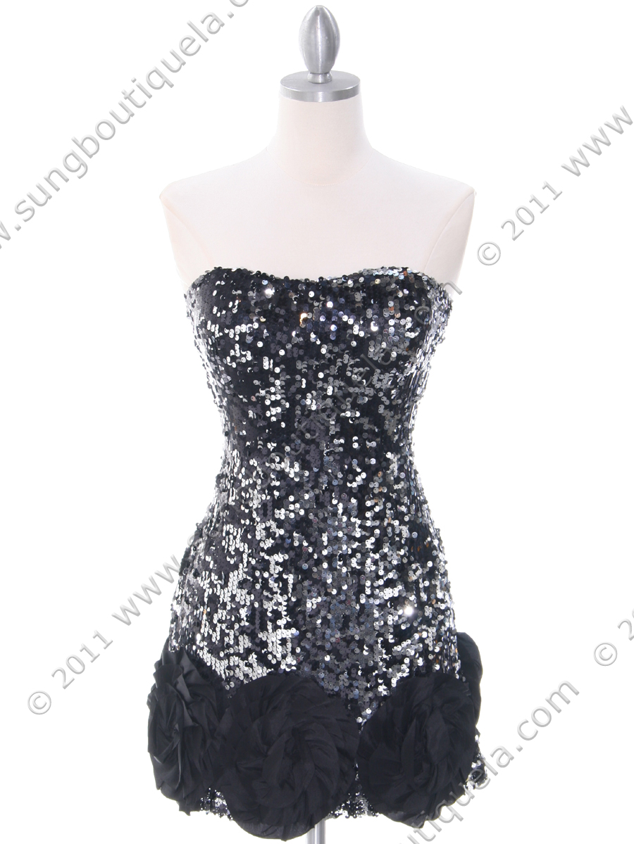 This flirty strapless sequins party dress features glittering sequins all over. Stretchy top band gives this dress a secure fit. Beautiful rosettes detail the hem line. - Slip on; no zipper. - Padded bodice. - Approx. 24 in. from underarm to hem. - 100% polyester. - Imported.