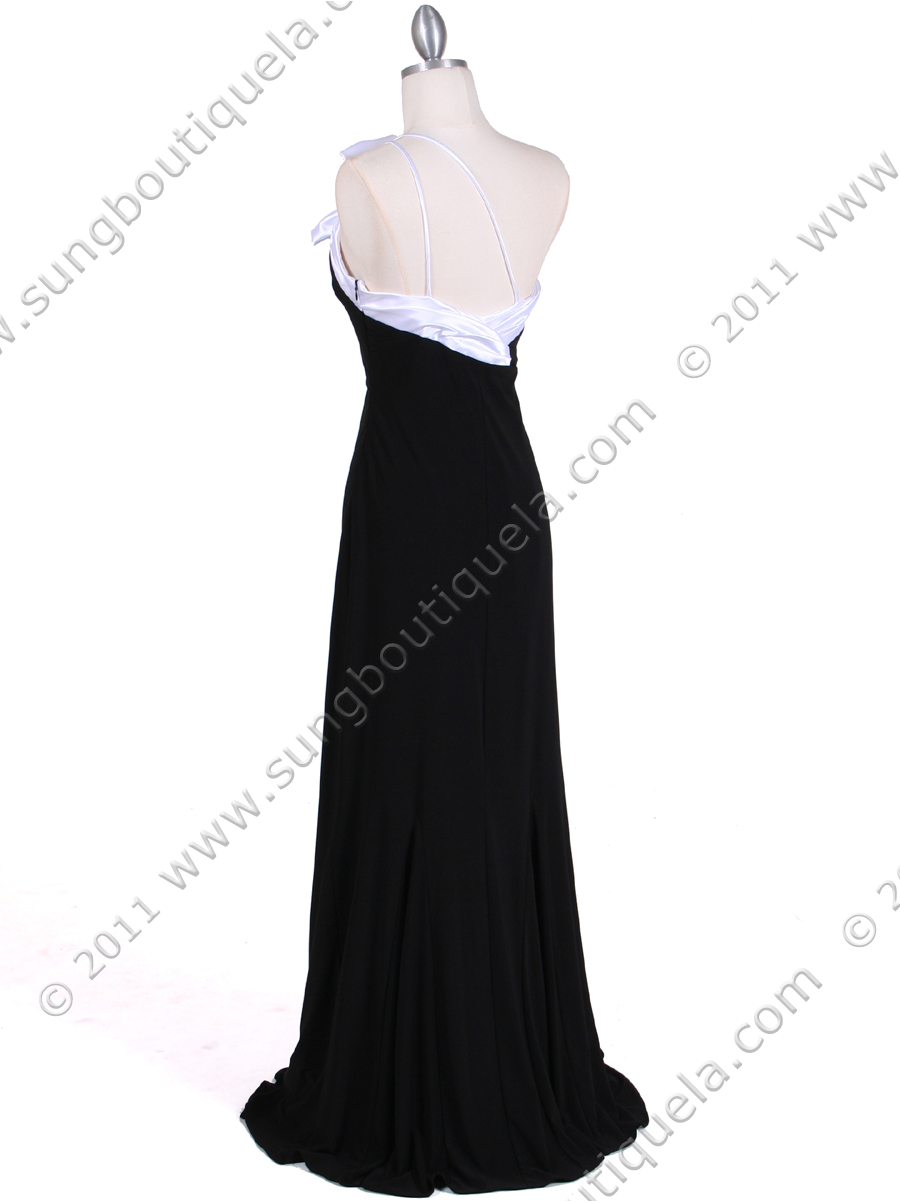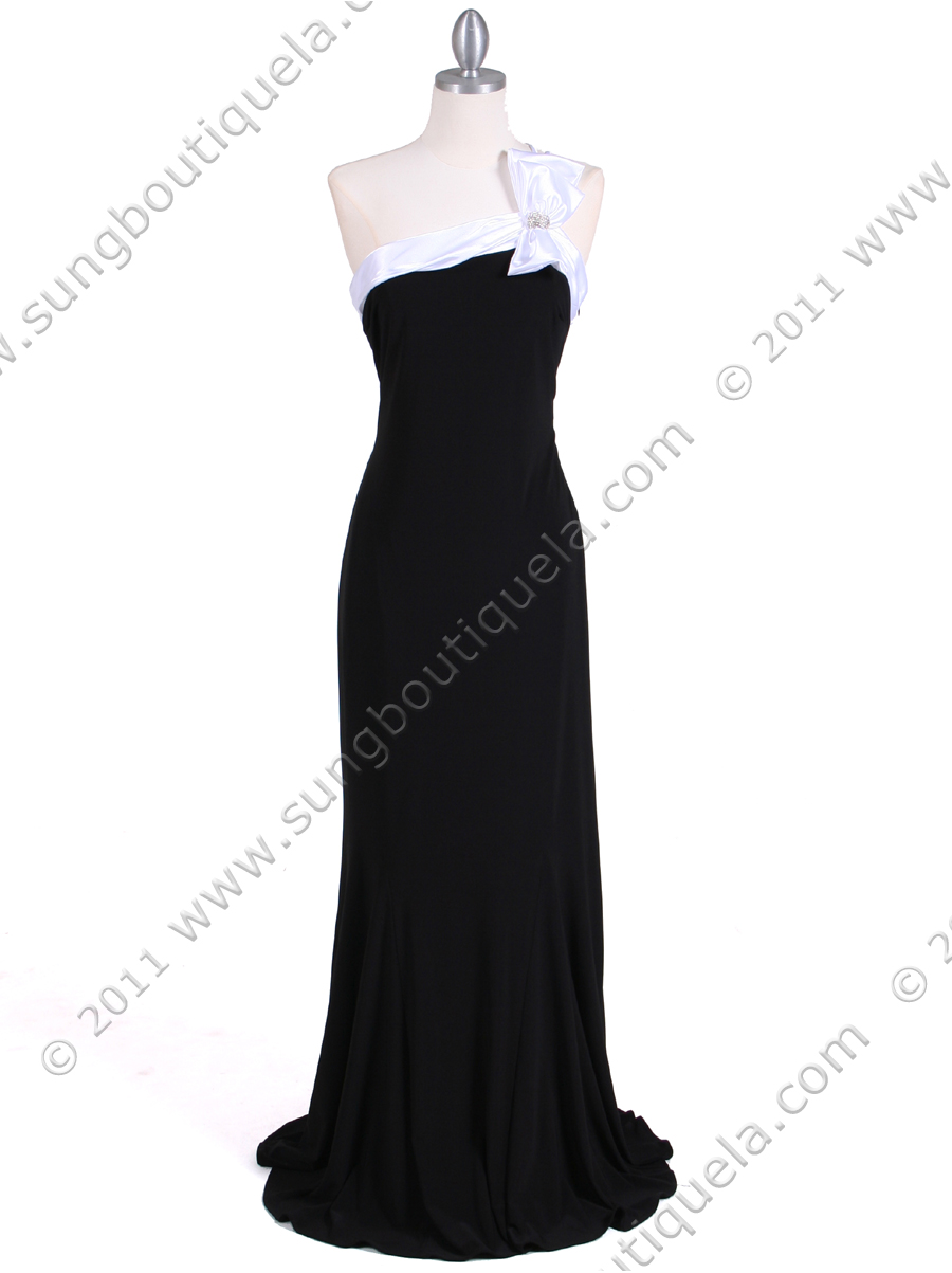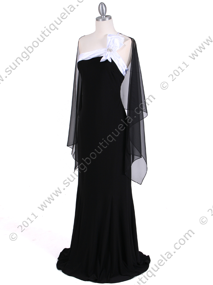 This elegant evening dress features a satin bow with rhinestone brooch details the shoulder of a flowing elegant, bias-cut dress. The paneled skirt with mesh godet insets adds movement. Side zipper. Matching included. Made in USA. 100% polyester.