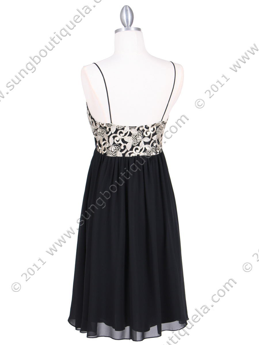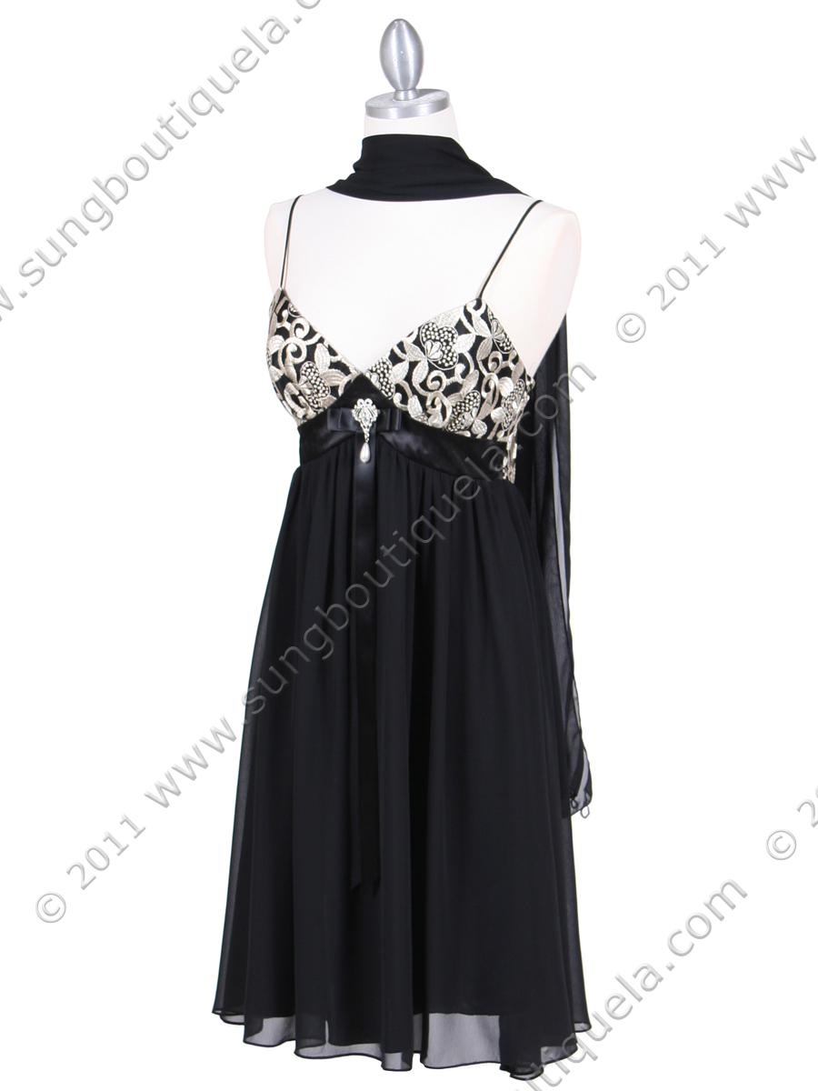 This beautiful cocktail V-neck dress features gold embroidery top with black underlay, satin bow adorns with antique-inspired pin. Empire waist with flowing chiffon skirt adds a sense of romance. Side zipper entry. Made in USA; 100% polyester; matching shawl is included.