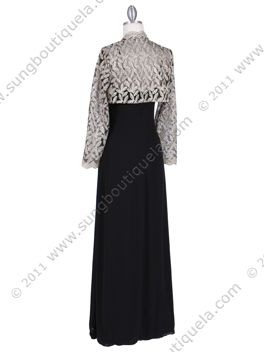 This gorgeous two piece ensemble is styled with a floor-length dress featuring spaghetti straps with simple neckline. Metallic-tone embroidered lace top with charmeuse waist adorn with a removable rhinestone brooch. Matching lace bolero jacket adds pretty coverage. Back zipper entry. 100% polyester. Made in USA.