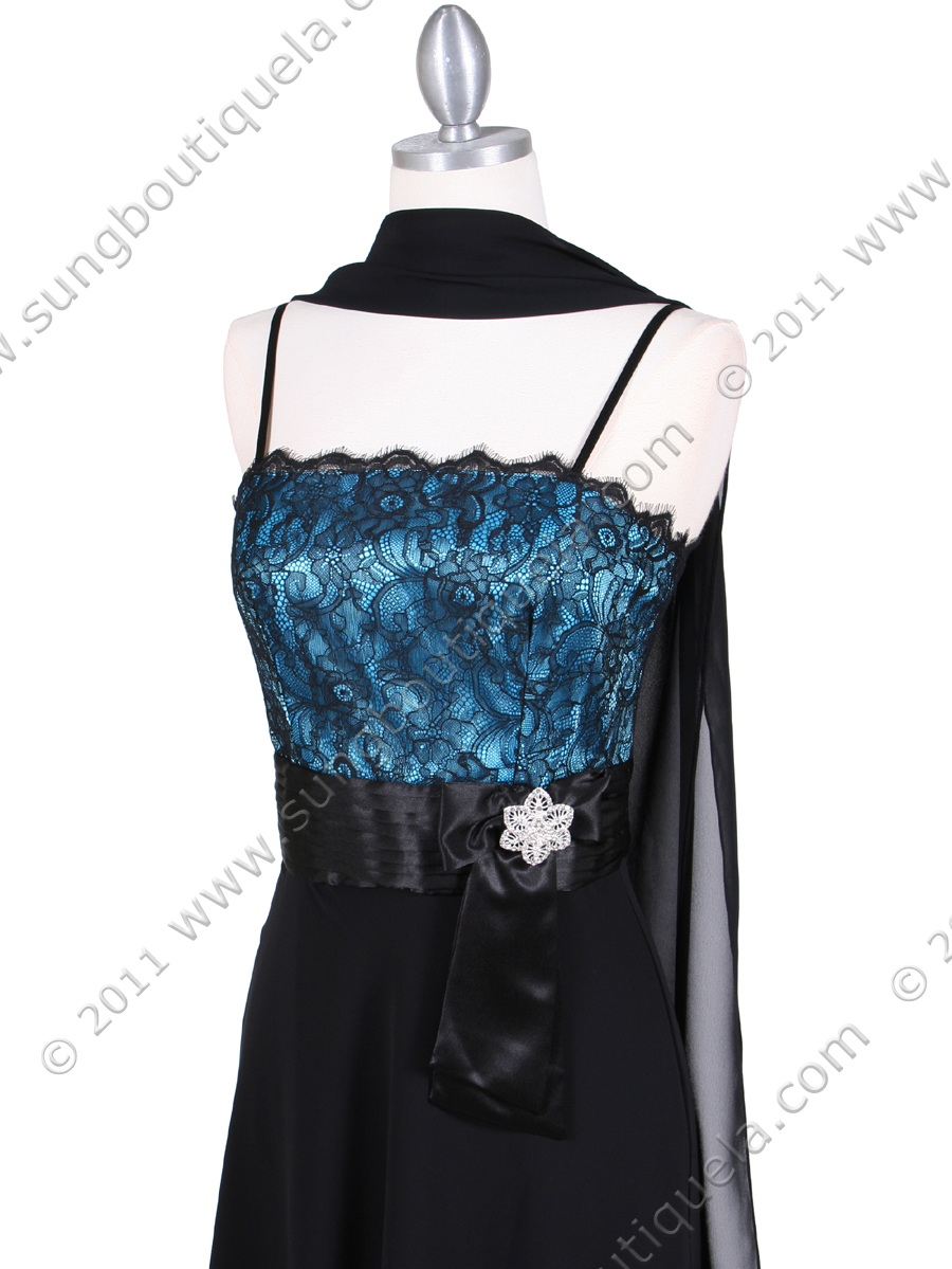 Simple and Sexy. This beautiful cocktail dress features spaghetti straps with simple neckline. Black lace over turquoise satin top with pleated satin waistband and bow adorn with a sparkling pin. A flowing chiffon skirt adds a sense of elegant. Back zipper entry. Matching shawl included. -Imported -100% polyester. -Padded. -Adjustable straps.