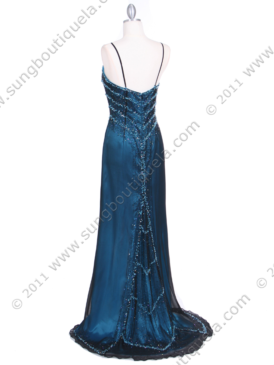 This glamorous silk evening gown features exquisite color beads adorn the front, the back and falling along the skirt. Black color silk overlays a brilliant turquoise color lining. High-low hemline finish with light train add sense of elegance. Removable straps and shawl are included. - Imported. - 100% silk. - Fully lined. - Built in bra cups. - Back zipper entry.
