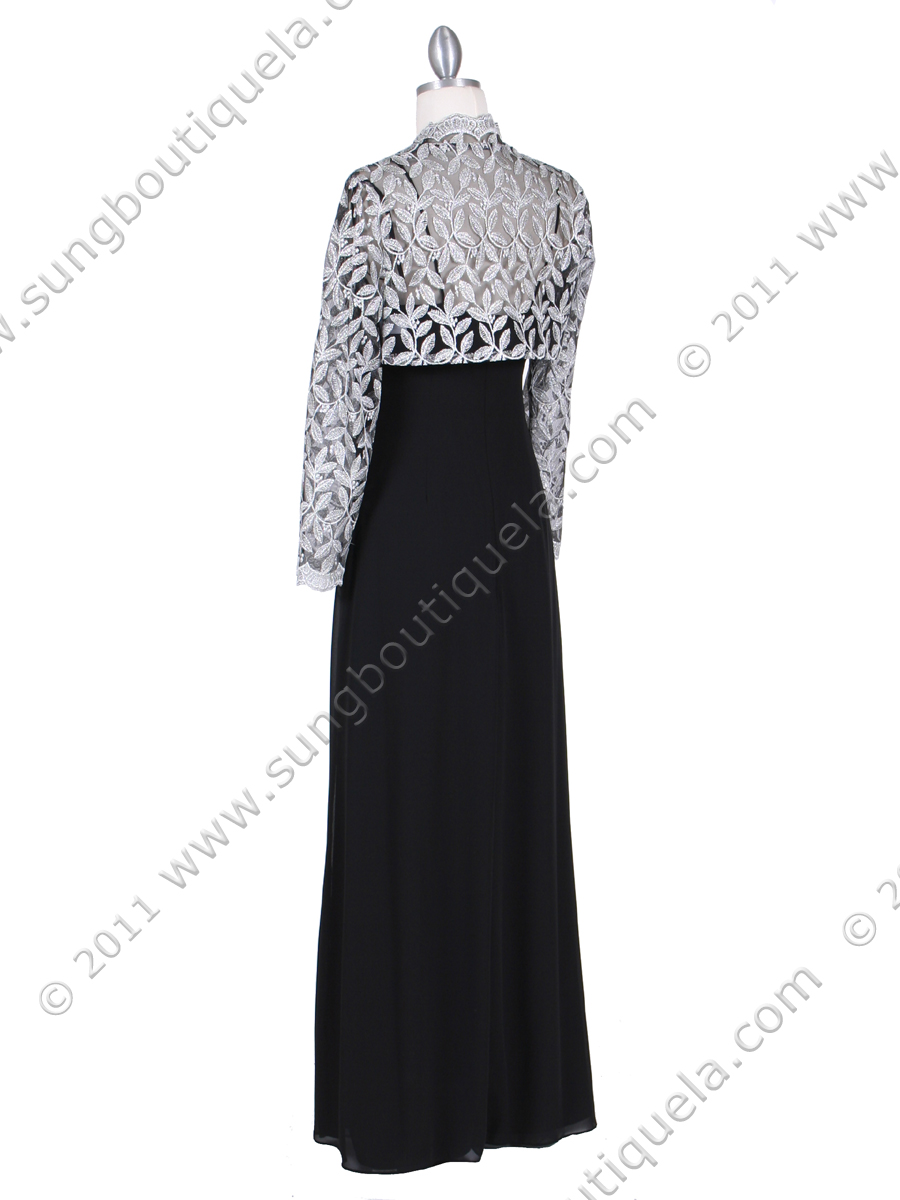 This gorgeous two piece ensemble is styled with a floor-length dress featuring spaghetti straps with simple neckline. Metallic-tone embroidered lace top with charmeuse waist adorn with a removable rhinestone brooch. Matching lace bolero jacket adds pretty coverage. Back zipper entry. 100% polyester. Made in USA.