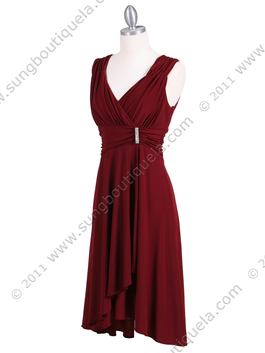 This elegant, faux-wrap dress, features pleated bodice with an elegant rhinestone buckle decorated on the side. High-low hem add a sense of elegant. Back zipper entry. Made in USA; 100% polyester.