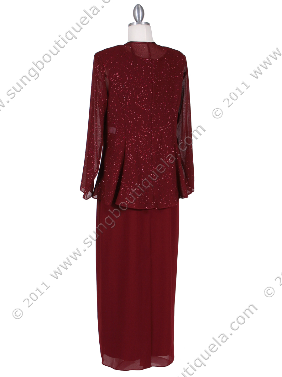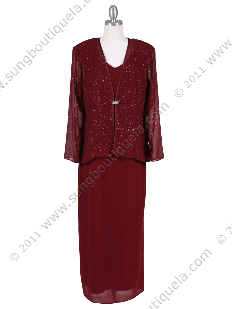 This beautiful two piece dress is styled with a floor-length tank dress. Shimmery textured jacket closes with a sparkly rhinestone clasp. - 100% polyester. - Imported. - Back zipper entry.