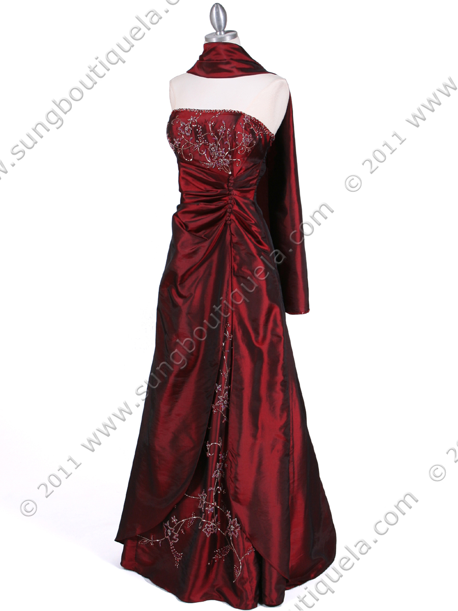 This elegant taffeta evening gown features flowery embroidery and beads adorn the neckline, bodice and the skirt. Faux-wrap over layer design and crisscross back with lower back zipper closure ensure the perfect fit and skims your shape. Matching shawl is included. Imported. 100% polyester. Removable straps included.