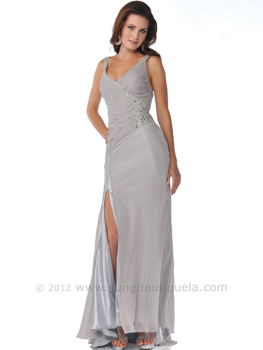 This captivating chiffon evening dress features sparkling jewels and sequins adorning the straps and ruched bodice. Floor length skirt with slit finishes the look. - Approx. 60 in. from shoulder to hem. - 100% polyester. - Imported.