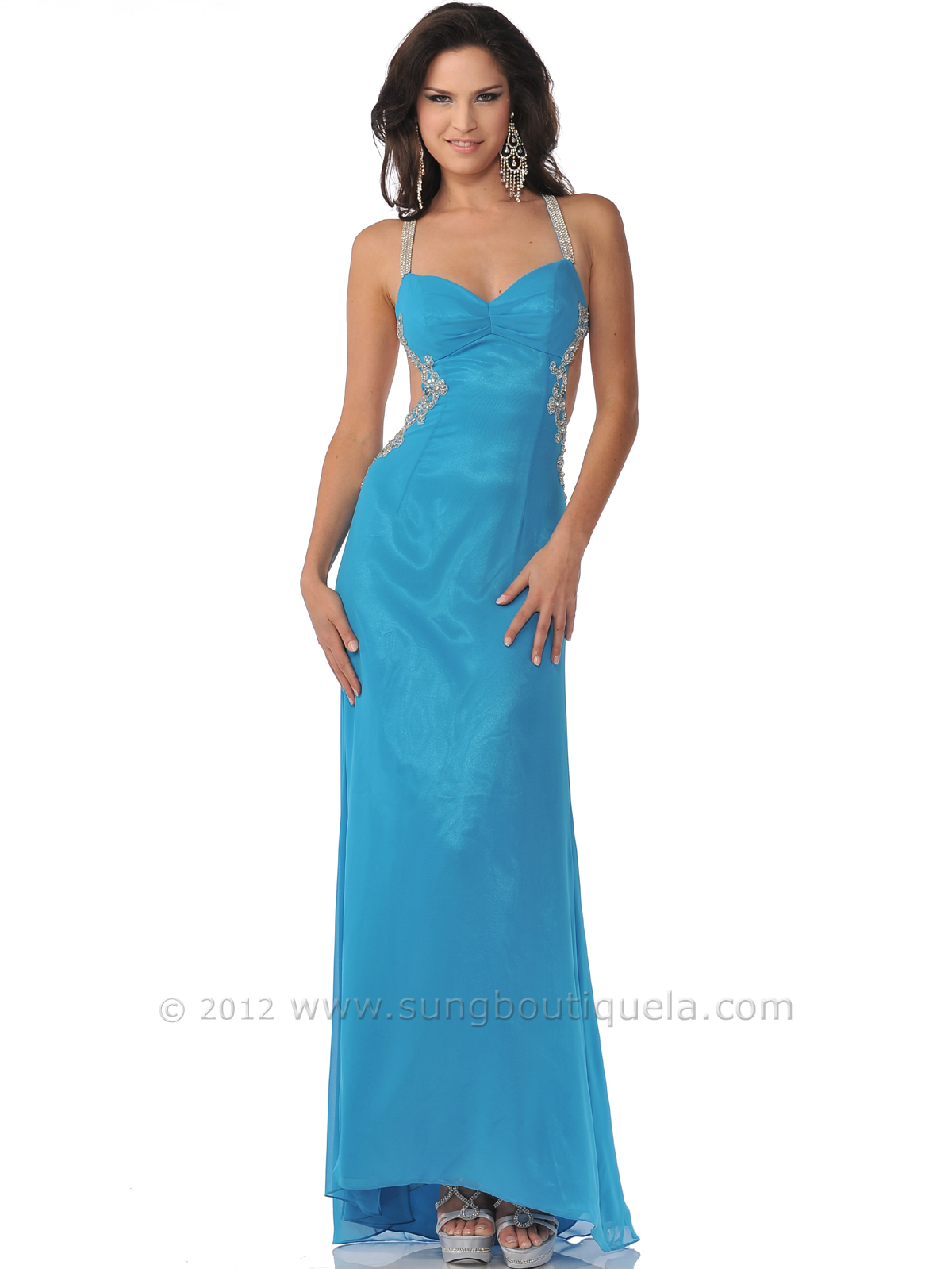 Beautiful prom dress feature rhinestone straps with cross back. Sweetheart neckline with slight side cut out details with sparkling floral pattern to the lower back br> - Padded bodice. - Approx. 60 in. from shoulder to hem. - Fully lined. - 100% polyester. - Imported.