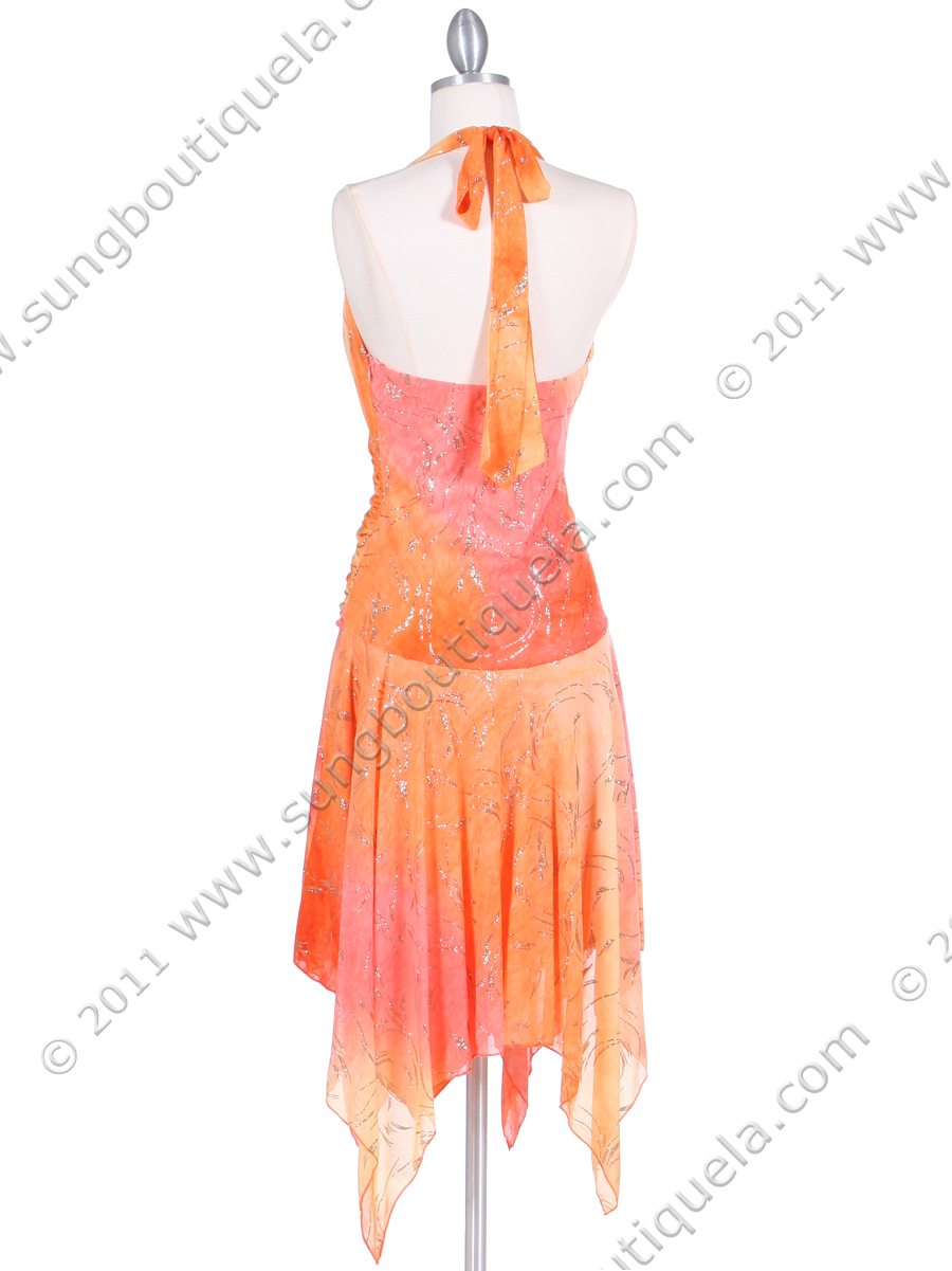 This stylish halter neck party dress features glittering print with removable floral pin adorns the front. Draped detail in front. Handkerchief hem adds a sense of romance. Sheer layers over solid lining. Side zipper. Made in USA; 100% polyester.