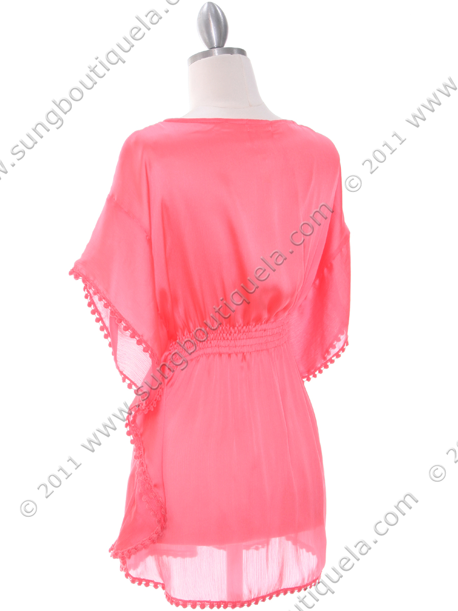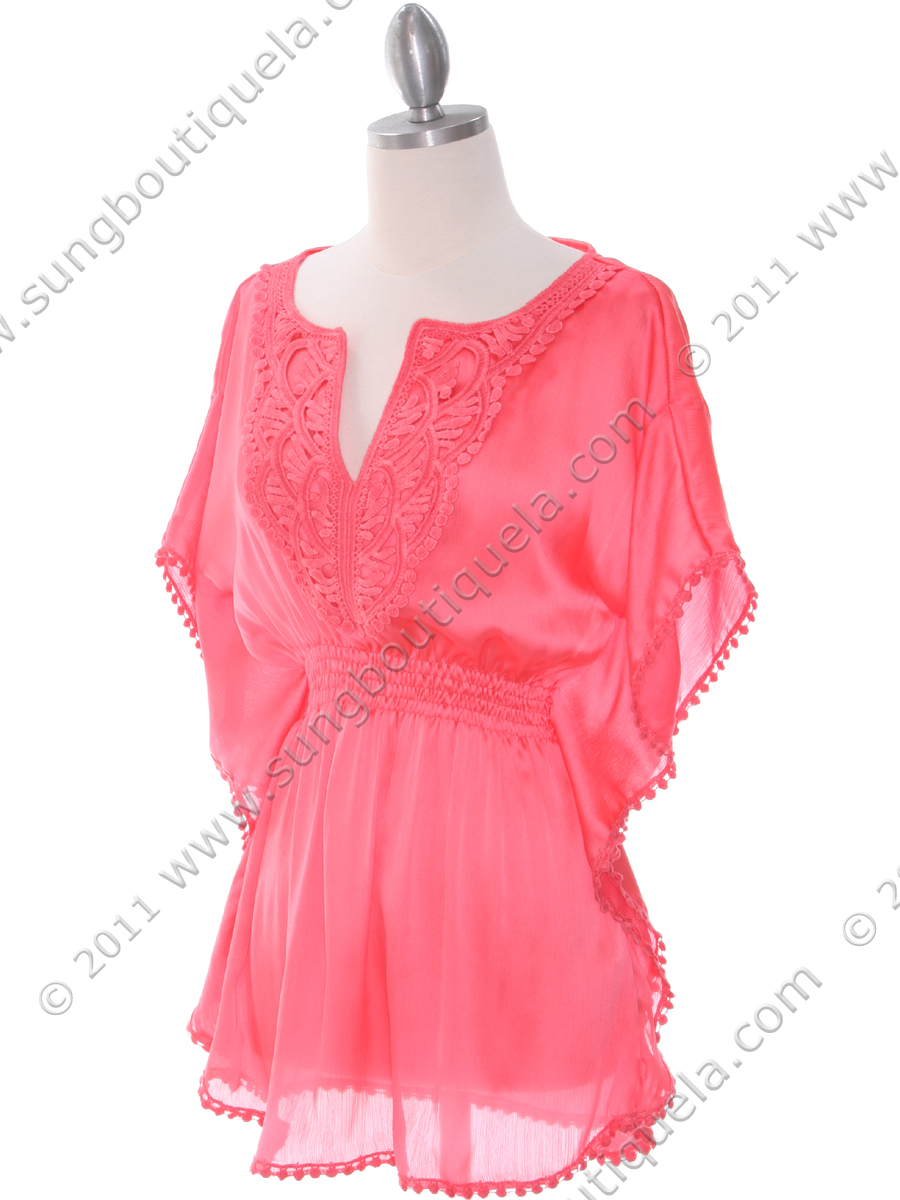 Beautiful chiffon top features crochet design with v-neckline. An elasticized waist cinches the waist for a slimming and fantastic look. - Approx. length from shoulder: 28 inch. - 60% silk and 40% polyester. - Imported.