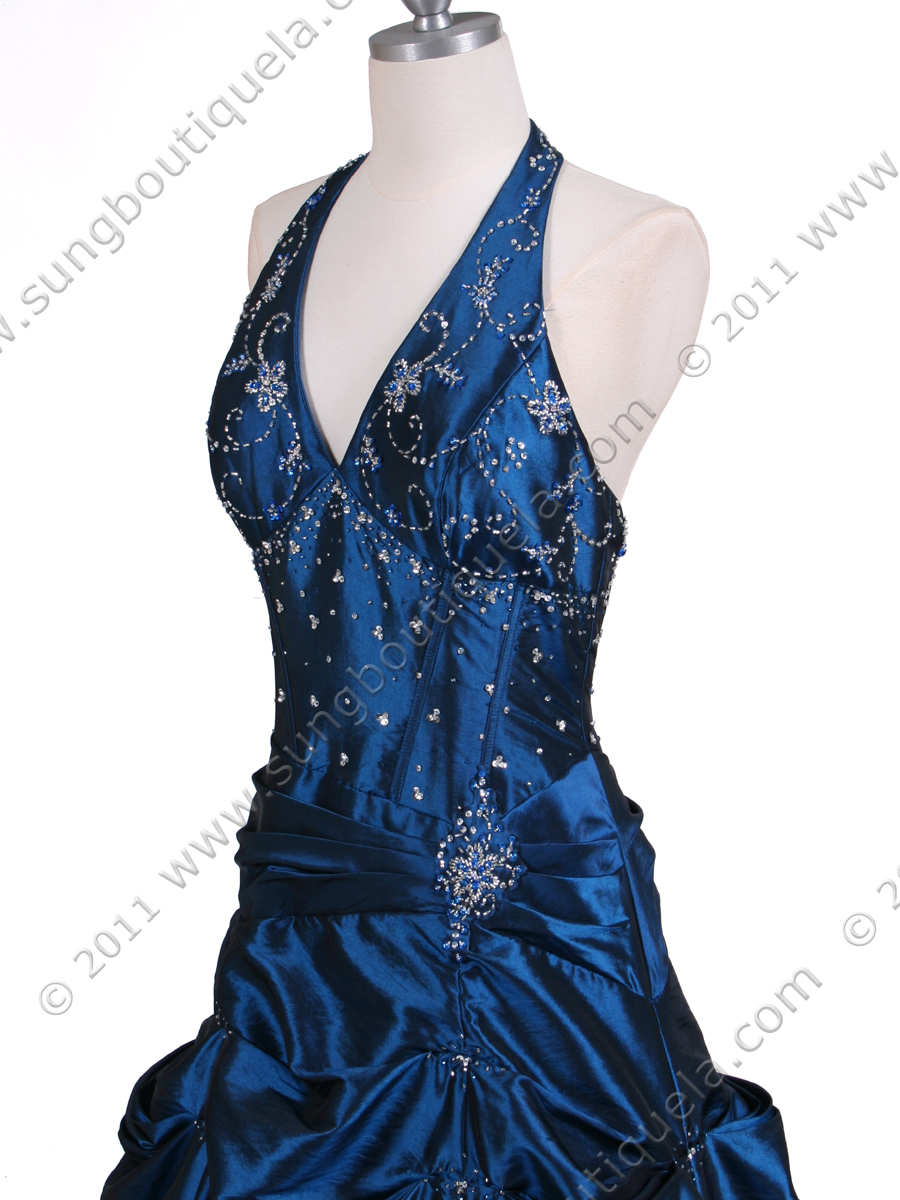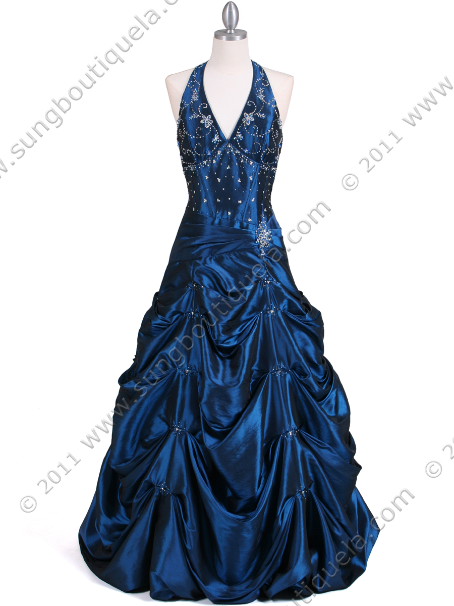This elegant and shimmering taffeta evening gown features halter neck with deep V neckline. Sparkling beads and sequins detail. Classic bell shape skirt with tulle-lined for volume. Imported. Back center zipper.