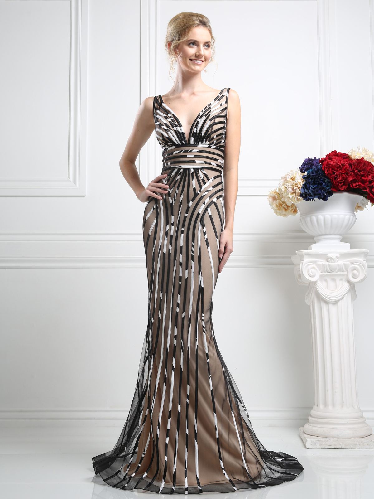 A nude gown is overlaid with a tulle layer that is appliqued with satin cords of two colors. The black and white striping adds a zebra print look to the silhouette. The A-line gown is a V-neck with a high waisted look. The back of the gown is a low V and accents the gown.