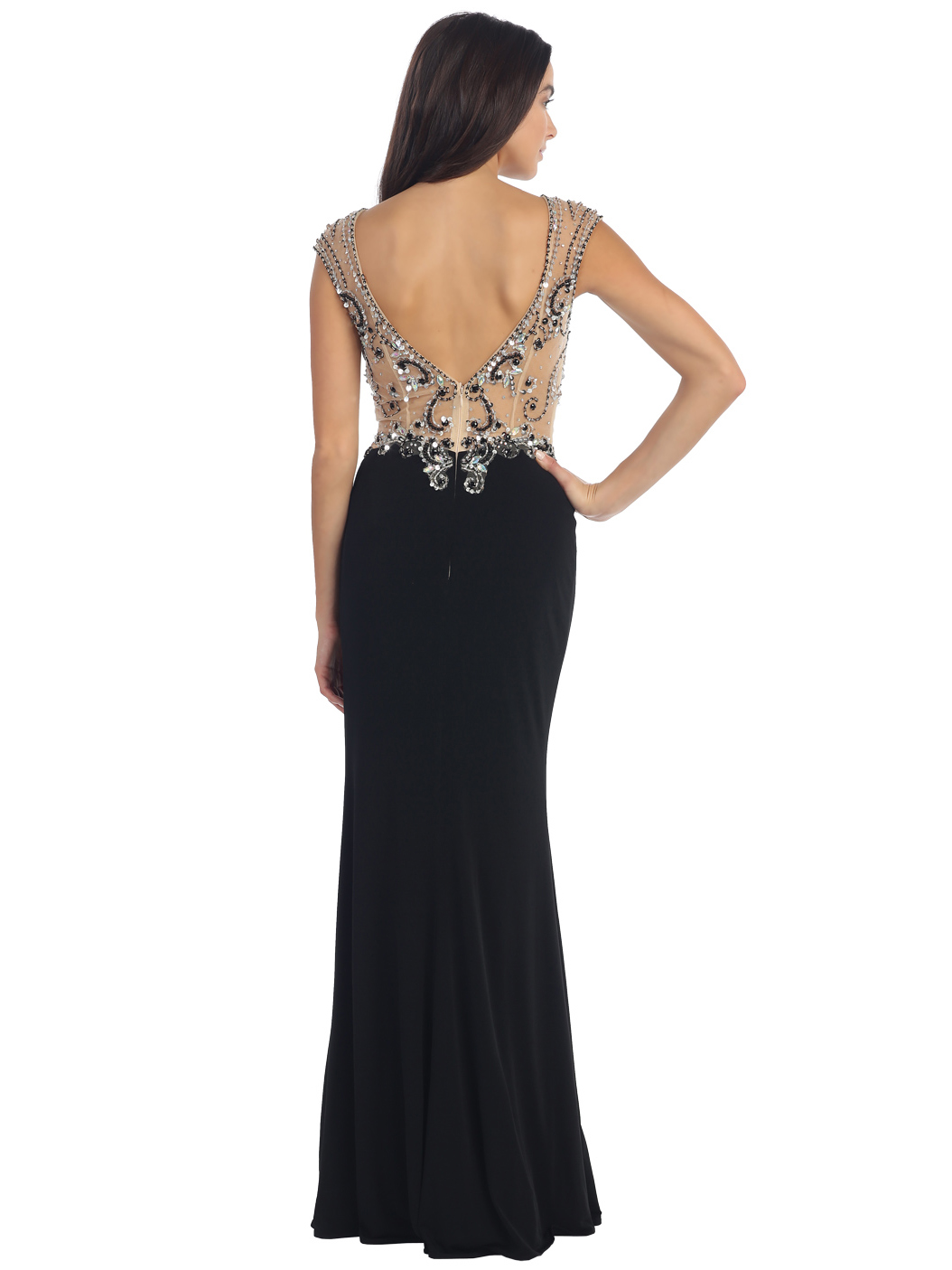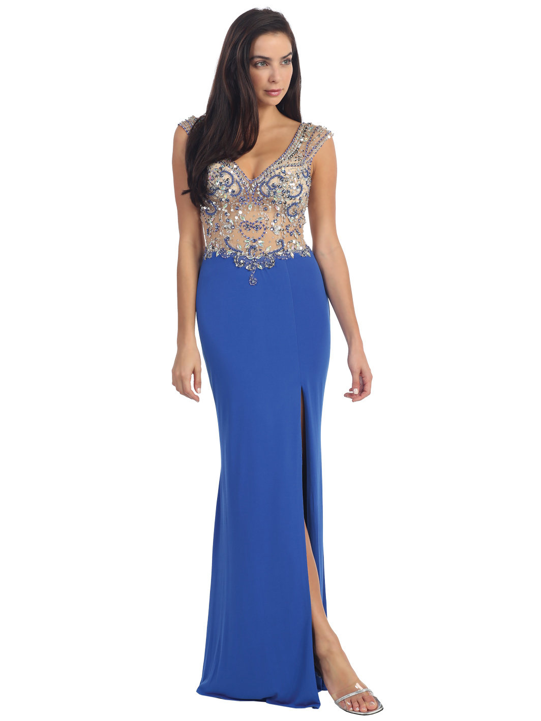 Iridescent stones and sparkling beads detailed up the sleeveless fitted bodice of a gorgeous dress. Curve-enhancing shaping detailed with a thigh-high slit completes the head turning look. -Approximate 60 inches from shoulder to hem. -Zipper back entry. -Fully lined. -Polyester. -Imported.