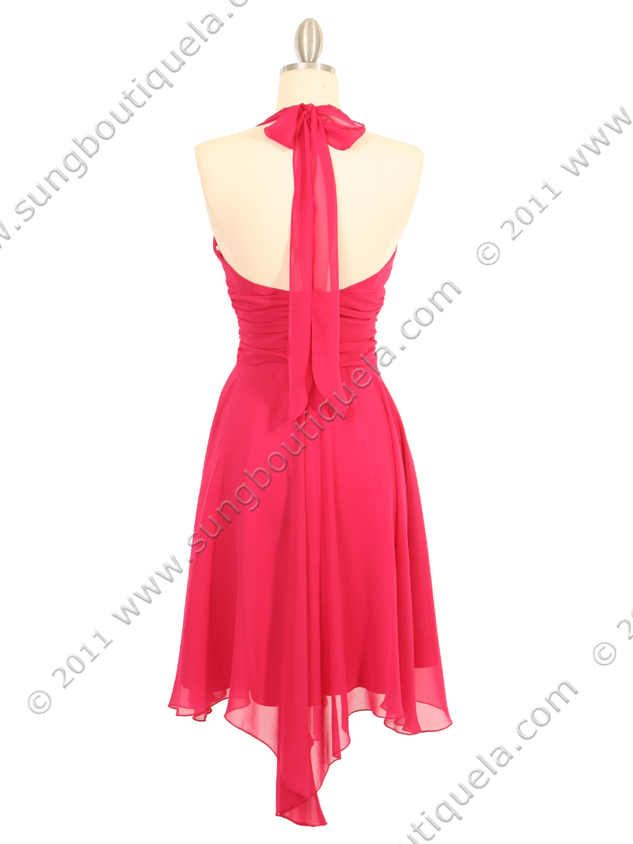 This daring V-neck halter cocktail dress features soft, fluid chiffon fabric with shirred bodice and a full, sweeping skirt finished with a four-point hankie hemline. Back center zipper. Made in USA; 100% polyester.