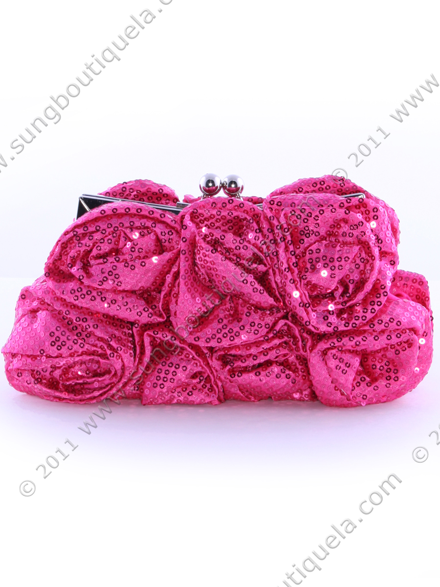 Beautiful sequins rosettes cover the front and the back of the shimmery evening bag. Kiss-lock closure. Available in Hot Pink, Black and Red color. - Dimensions (inches): 9 W x 5 H x 2.5 D. - Shoulder chain strap drop: 22 inches. - Hand held chain strap: 7inches. - Imported.