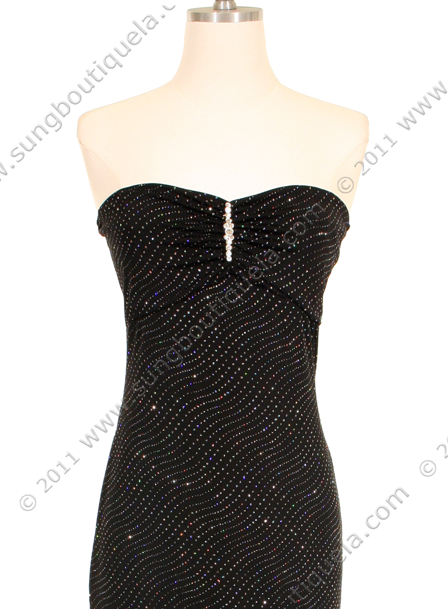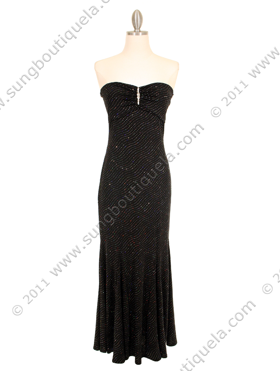 This glittering jersey evening dress features sweetheart neckline, shirred bust with rhinestone pin. Soft and comfortable stretch tube top finished with flare fluid flirtatious skirt. Made in USA; 100% polyester.