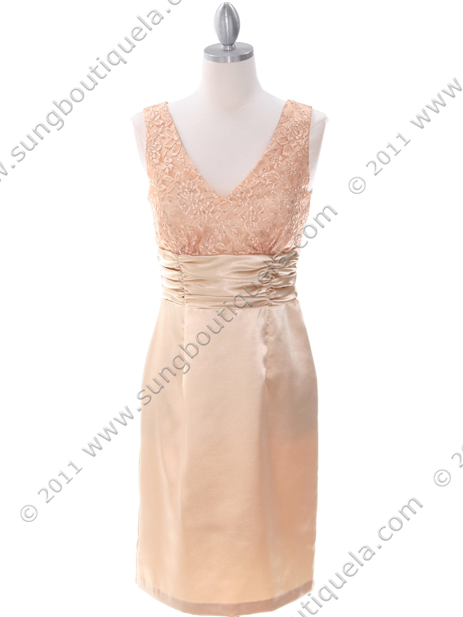 This sweet and sassy cocktail dress features a lace V-neckline overlaying a gold tone bodice. Satin fitted skirt is alluring to the eye. - Back zipper. - Built in cup. - Approx. 38 in. from Shoulder to hem. - Polyester. - Made in USA.