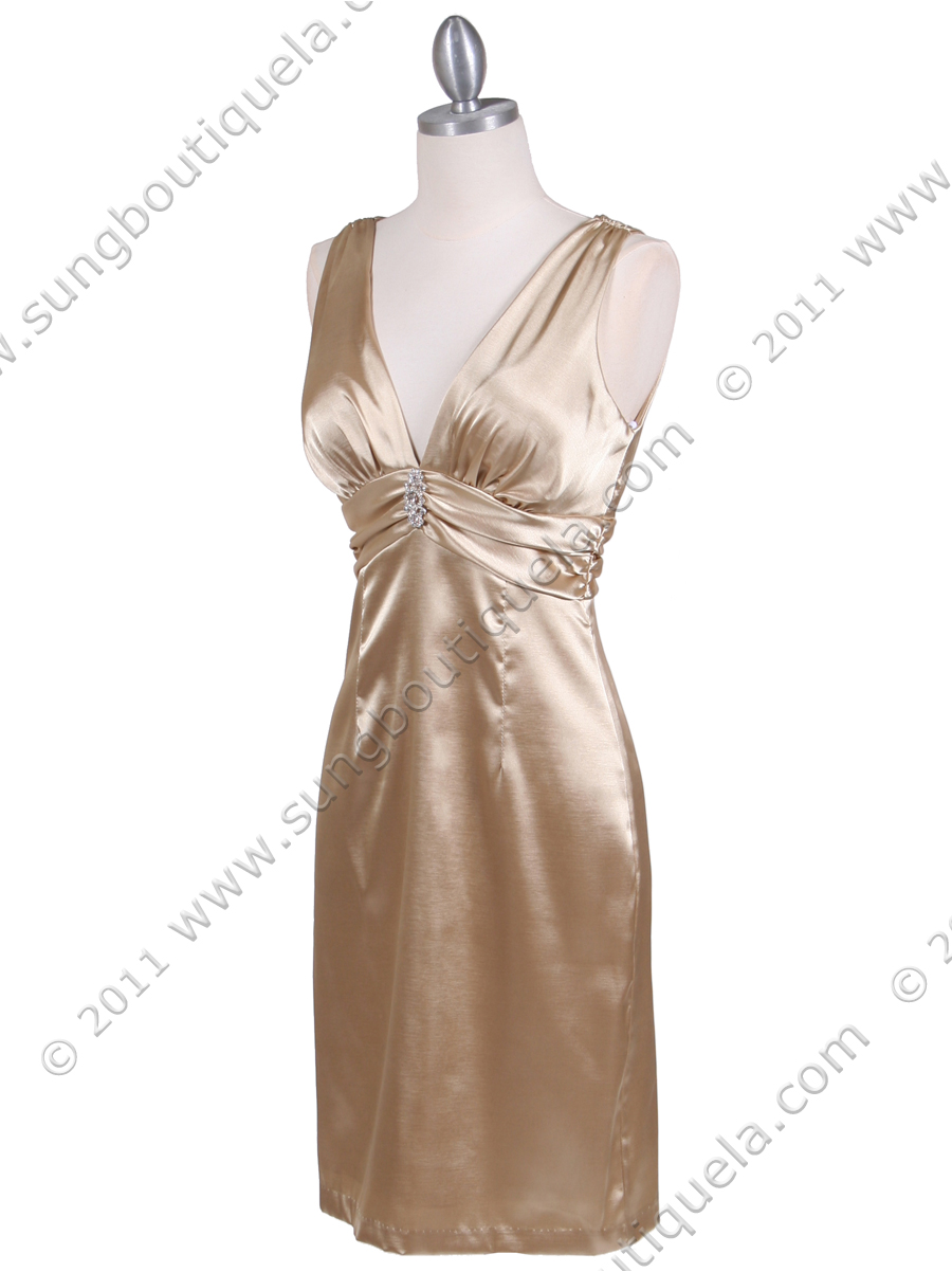 This elegant sleeveless cocktail dress features stretch satin with a flattering V-neckline in front and back. Wrapped bodice with a sparkling rhinestone pin adorn the front. Back zipper entry. Made in USA; 100% polyester.