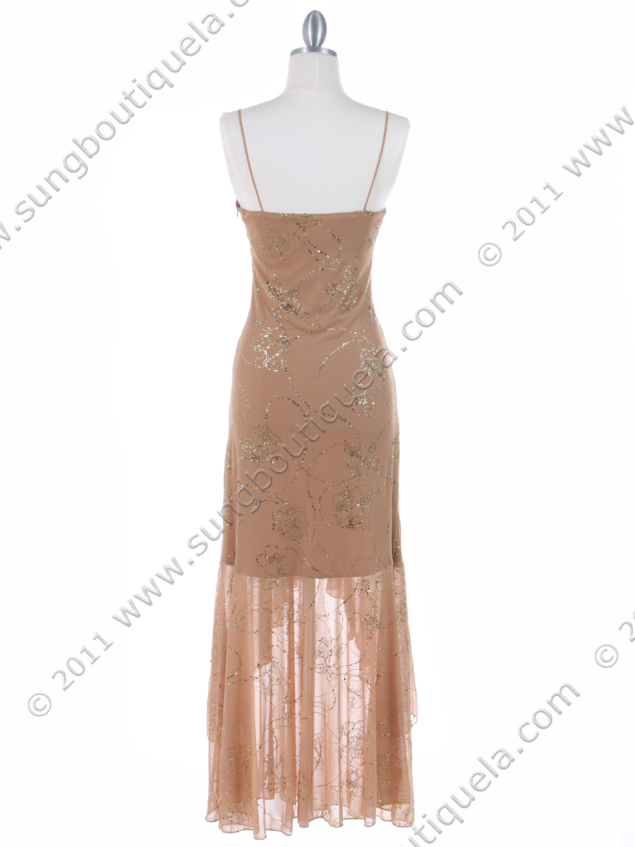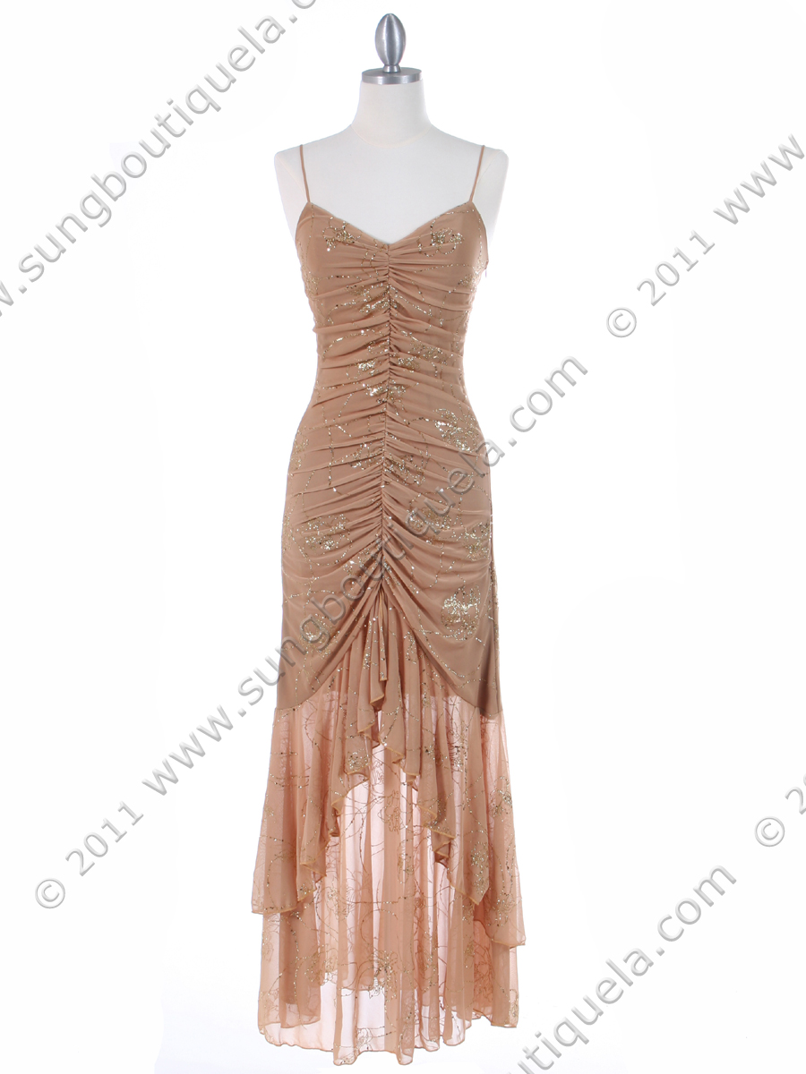 This beautiful matt jersey dress features spaghetti straps, shirred bust and printed glittering floral pattern. Drop waist with ruffled layered hem. Side zip. This is the dress for that special occasion. Made in USA; 100% polyester.