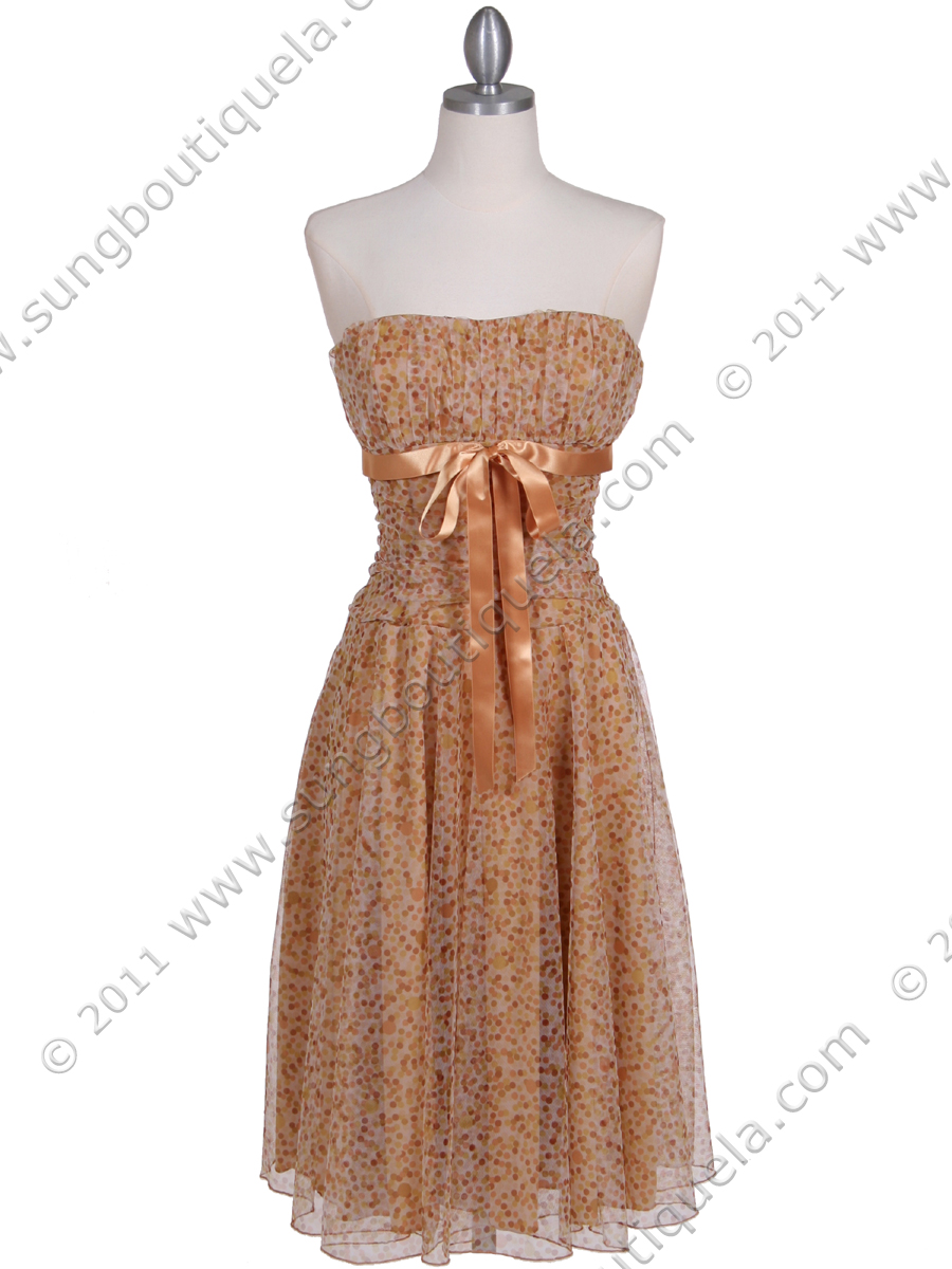 This beautiful strapless tea length dress features pleated bust with satin sash tie at the upper waist. Stretchy top band with shirred bodice give this knit mesh dress a secure fit. - Matching shawl included. - Slip on; No zipper. - Padded bust. - Approx. 38 in. from underarm to hem. - Fully lined. - 100% polyester. - Made in USA.