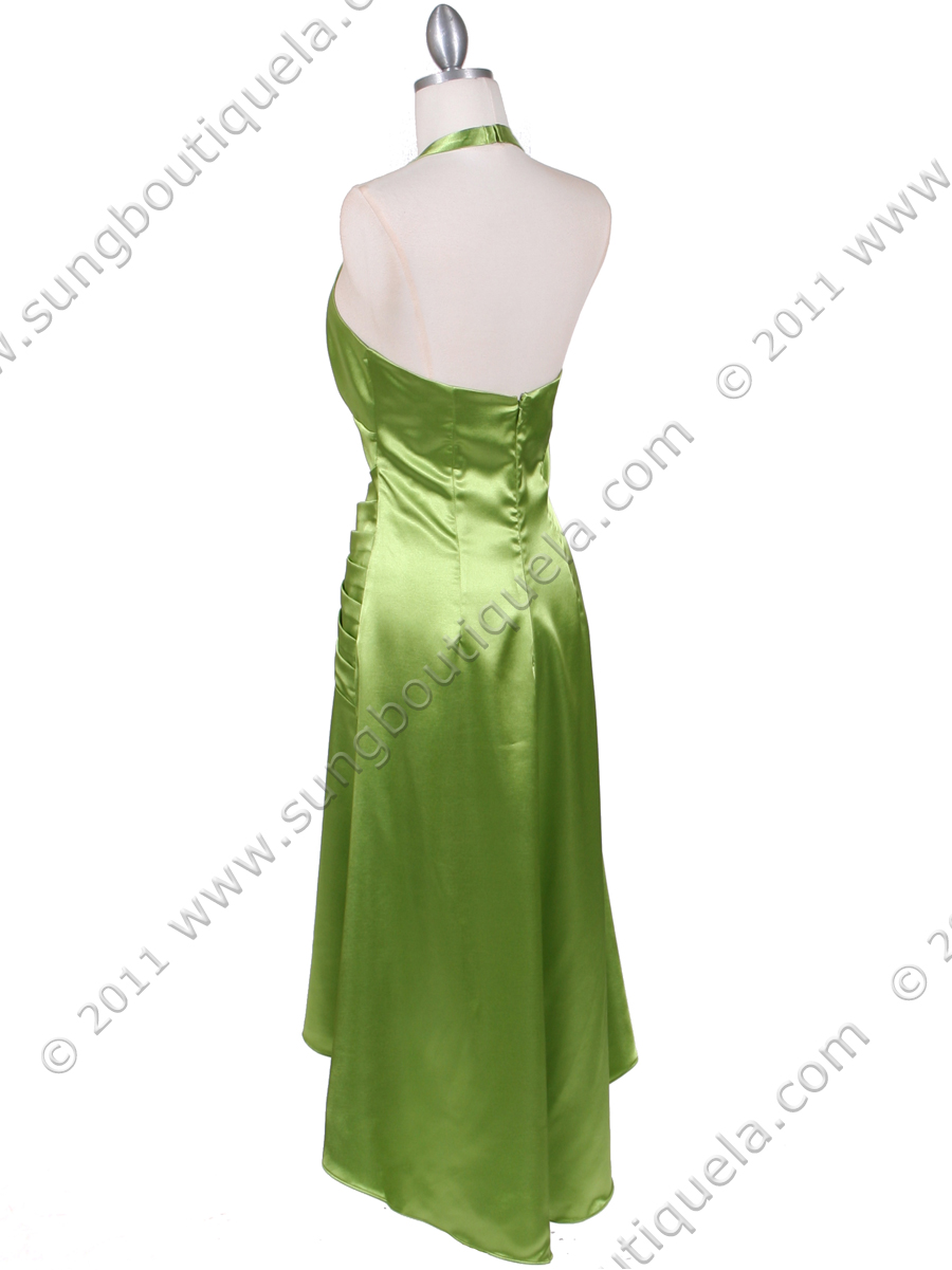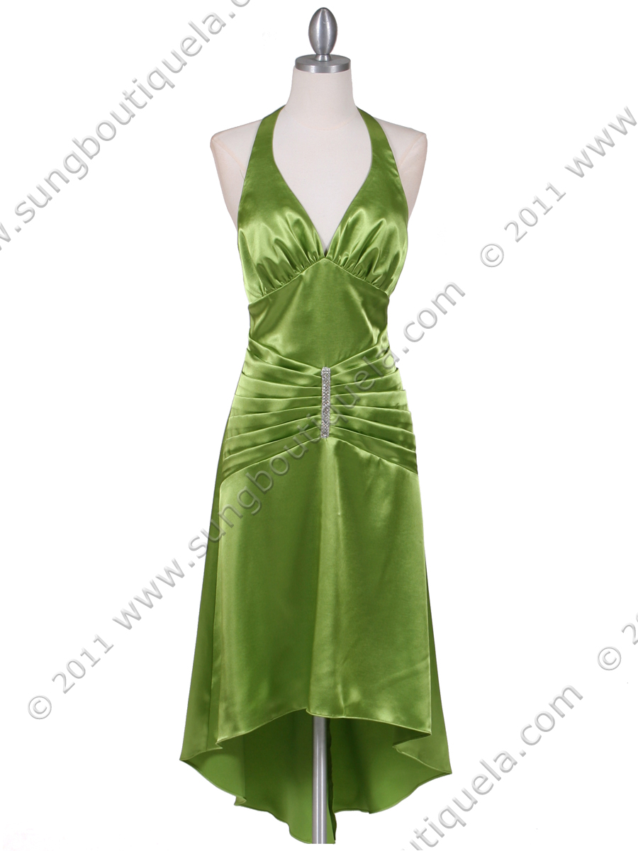 This lovely satin cocktail dress features halter neck with deep v neckline. Shirred drop waist adorns with dazzling rhinestone pin. High/low hemline finishes the look. Imported. Back center zipper. 100% polyester.