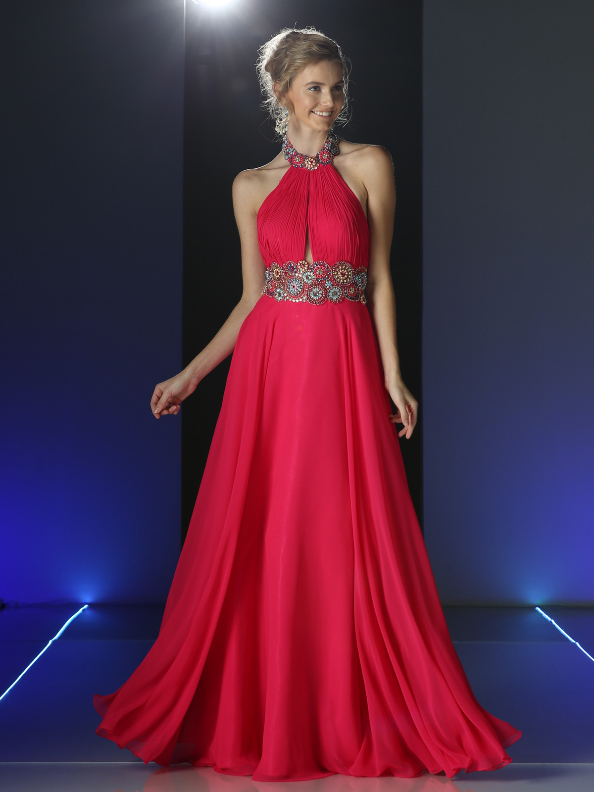 Backless halter top is pleated in the front and creates a Grecian style silhouette. The neckline and waist are embellished with circular bead work patterns. Brightly colored and elegant. There is a small peek-a-boo moment in the front of the bodice and the pleated chiffon skirt falls elegantly to the floor.